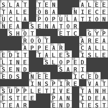ACROSS 1. Narrow board 5. "___ Little Indians" 8. Toward shelter 12. Lie 13. Chief or king in Benin or Nigeria 14. Sibling's daughter 15. Southern CA. univ. 16. Census information 19. Teachers' org. 20. Legislator 21. Went for two points 23. And so on (abbr.) 24. Con 27. Carrot, for example 30. Type of rug 31. Seem 34. Give a ring to 35. Prepare for publication 38. Lies 40. Capri or Wight 41. Actor's bit 42. Had an oblique or slanted direction 44. Post 45. Indian skirt 46. Begley and Asner 47. Born 50. On the rocks 53. Stimulate to action 57. Large container 59. Supplementary 63. Hyperbolic tangent 64. First name in cosmetics 65. Baking dish 66. The content of cognition 67. Lacerate 68. Conclude 69. Trial DOWN 1. Make senseless or dizzy 2. Shoestrings 3. Assad's deity 4. Afternoon social gathering 5. Drink excessively 6. Inky black, to poets 7. California wine valley 8. Small island 9. Luau accessory 10. Environmental prefix 11. Car or cant ending 14. Drug cop 17. Shoshoni 18. Car dealer's back yard 20. Obstruct or block passage 22. Declaimed 24. Pate de foie ____ 25. Shout 26. Light colored 28. Elect 29. Afternoon social gatherings 30. Being or containing an acid 32. 100% 33. Vintage cars 35. Otherwise 36. Passed on 37. Lodging establishments 39. Health resort 43. 4th largest of the Great Lakes 47. The longest river in the world 48. Compass dir. 49. Eastern Standard Time (abbr.) 51. Dodge 52. Natives or inhabitants of Denmark 54. Corncob 55. _ the terrible 56. Tear apart 58. Not this but _ 59. Put into a specified state 60. Purpose 61. Parent Teacher Association (abbr.) 62. For each 63. Teat (slang)