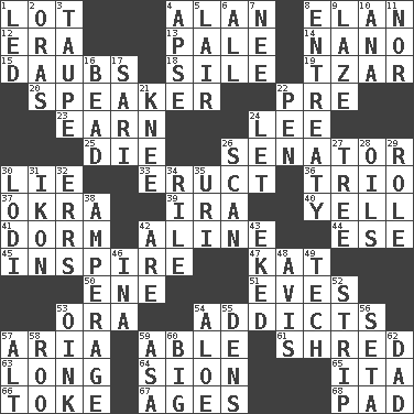 ACROSS 1. Car dealer's back yard 4. Actor Alda or Thicke 8. Style 12. Period 13. Light colored 14. Billionth: prefix 15. Applies to a surface 18. Filth; sediment 19. Russian ruler 20. Orator 22. Before (prefix) 23. Merit 24. Area sheltered from the wind 25. Expire 26. Elected representative 30. Falsehood 33. Spew [out] 36. Musical group of three 37. Gumbo ingredient 39. Retirement account (abbr.) 40. Shout 41. Dormintory (informal) 42. Place in a line 44. Compass dir. 45. Stimulate to action 47. Krazy ___ of comics 50. Compass dir. 51. Nights before holidays 53. Mouth or opening 54. Inveterate users 57. Operatic vocal solo 59. Competent 61. Fragment 63. Having great length 64. The Jewish people; Israel 65. Call ___ day 66. Puff or smoke 67. Grows older 68. Writing tablet DOWN 1. Directed 2. Mouths or openings 3. Grayish beige 4. Domed church section 5. Den 6. 100% 7. Born 8. Plea 9. Goldbrick 10. Santa ___, CA 11. Not either 16. Necklace unit 17. Indian skirt 21. Leg joint 22. Writing instrument 24. Allow 26. Examine hastily 27. Family _ (genealogy) 28. Lubricates 29. Hero or heavy, e.g. 30. Farming town in central California 31. Visual representation of an object 32. Blunders 34. Cause heat under the collar 35. RI univ. 38. Electrical Measurement 42. "We ___ not amused" (Victoria) 43. Supplemented with great effort 46. _ tizzy (2 wds.) 48. Deliberation 49. Technical 52. Empty completely 53. Pig sound 54. Medicinal plant 55. Hiding places for outlaws 56. Bristle 57. The first octave above the treble staff 58. Friend of Pooh 59. White ___ sheet 60. Massive 62. June honoree