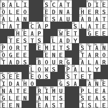 ACROSS 1. Indonesian resort city 5. Jazz singing style 9. Expire 12. Butter sub 13. Pulitzer Prize-winning author Ferber 14. Possessive pronoun 15. Actor Alda or Thicke 16. He sold his birthright 17. Blind as ____ 18. Make lace 19. Head covering 21. Chalkboard 22. Pile 24. Dripping 26. Turn to the right 27. Trials 28. Kenny Rogers chart-topper in '80 29. Left side of a ship or aircraft 30. Sends forth 32. Comedian Laurel of Laurel & Hardy 36. Double curve, resembling the letter S 37. Compass dir. 38. Edible starchy tuberous root 39. Small boys 40. French market town 42. Having or resembling wings 43. Coldest temperatures 44. Friendly 46. Perceive with the eye 49. Greek goddess of the dawn 50. Proofreading order 51. Potato state 53. Girls' org. (abbr.) 54. One (Scot) 57. Nathan's nickname 58. Tall New Zealand timber tree 61. Entreaty 62. Small, secluded valley 63. Pismires 64. Oceans 65. Car or cant ending 66. Compass direction 67. Capri or Wight DOWN 1. Water vessel 2. Silent film actress Nazimova 3. Resembling or made to resemble leather 4. Electrically charged atom 5. Ooze 6. Music discs 7. Santa ___, CA 8. The 19th letter of the Greek alphabet 9. Debunk (Brit. slang) 10. Feeling or showing extreme anger 11. First name in cosmetics 14. Actor Linden 19. Domesticated feline 20. Domed church section 21. Filthy place 23. _____ Park, CO 24. Wetness 25. Begley and Asner 27. Ancient Roman robe 28. "_ and Lucy" (Charlie Brown theme song) 29. Plant holder 31. Catcalls? 32. Having lost freshness 33. Baron Munchausen's specialties 34. Like ___ of sunshine 35. And not 40. Sometimes accompanies a hiss 41. Global Positioning Systems (abbr.) 43. Lion 45. "One Day ___ Time" 46. Burn superficially 47. Peak District village in England 48. Ingested 52. Layer 53. Abrupt rush of wind 55. Be tempered by heat 56. Comfort 58. Actress Charlotte 59. _ tizzy (2 wds.) 60. Mountains (abbr.) 61. 23rd letter of the Greek alphabet