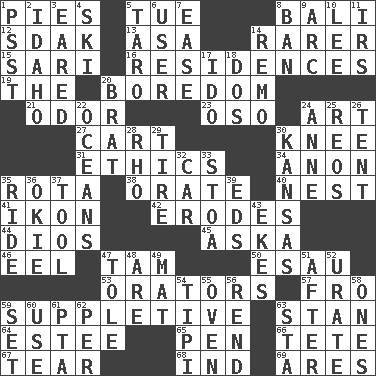 ACROSS 1. Sliced desserts 5. Third day of the wk. 8. Indonesian resort city 12. Neighbor of Neb. 13. White ___ sheet 14. More uncommon 15. Indian skirt 16. Homes 19. Definite Article 20. Mood resulting from idleness 21. Scent 23. Bear (Spanish) 24. Nonscientific branch of learning 27. Haul 30. Leg joint 31. Principles of right and wrong 34. At once, immediately (arch.) 35. Roll call or roster of names 38. Speak pompously 40. A home for chicks 41. Picture 42. Eats (away) 44. "Vaya con ____" 45. "____ silly question..." 46. Snakelike fish 47. Scottish cap 50. Son of Isaac 53. Speakers 57. Back 59. Supplementary 63. Comedian Laurel of Laurel & Hardy 64. First name in cosmetics 65. Animal enclosure 66. False hair 67. Pull apart 68. Working for oneself (abbr.) 69. Ancient Greek god of war DOWN 1. Inconspicuous attention getter 2. Potato state 3. Having ears or earlike features 4. What Jean-Claude Killy likes to do 5. Edible starchy tuberous root 6. One who makes use of a thing 7. Comfort 8. Forbid 9. Curve 10. Area sheltered from the wind 11. Big collection agency 14. San ____ (Riviera town) 17. Wedding promise 18. Two (Sp.) 20. Naughty child 22. Seas 24. Queen of England 1702-14 25. Vintage cars 26. Portable shelter 28. 17th letter of the Greek alphabet 29. Hoop that covers a wheel 30. Sunflower state 32. Auto 33. Portico 35. Travel on or in a vehicle 36. Migrant worker of the '30s 37. Utensil 39. Begley and Asner 43. Supplements with great effort 47. Lacquered or enameled metalware 48. "We ___ not amused" (Victoria) 49. Floor covering 51. Following 52. A salt of uric acid 54. Native american tent (variation) 55. Baking chamber 56. Tear apart 58. Washington bills 59. Put into a specified state 60. Purpose 61. Parent Teacher Association (abbr.) 62. For each 63. R.R. building