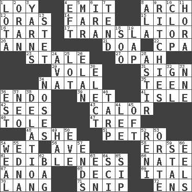 ACROSS 1. Myrna of the movies 4. Give off 8. Bowlike part 12. Mouths or openings 14. Conductor's collection 15. _ and Stitch 16. Small pie 17. Interpreter 20. Singer Murray 21. ___ good deed 22. Tax preparer (abbr.) 23. Lacking originality or spontaneity 27. Brightly colored fish 29. Short-tailed, large-bodied rat 31. Public display of a written message 34. Brizilian seaport 35. Adolescent 36. Inside; within (prefix) 39. Remaining after all deductions 41. Small island 42. Observes 43. Bodily heat indicating an inflammation 46. Lacquered or enameled metalware 47. Unclean, religiously 48. American tennis player Robert 51. Stone: prefix 54. Dripping 56. "___ Maria" 58. Celtic language 61. The property of being fit to eat 66. Nathan's nickname 67. Small Philippine buffalo 68. Tenth: prefix 69. Slanted text style (abbr.) 70. Austrian-born American filmmaker Fritz 71. Sever or remove by pinching or nipping 72. Followers of ems DOWN 1. Globular water bottle used in Asia 2. Northwest Algerian city 3. Tall tales 4. Newt 5. Make imperfect 6. Lyricist Gershwin 7. Look after 8. Insect wing 9. Actors Guy, Robert Welles, and Clint 10. Hoof sound 11. Israeli folk dance 13. Proofreading order 18. "Barney Miller" actor Jack 19. Pet locale 24. Actress Gardner 25. Car dealer's back yard 26. Liveliness 28. Moving or stirring 30. Choose 32. Set 33. Compass dir. 34. Olfactory organs 36. Eastern Standard Time (abbr.) 37. Modern: prefix 38. Accusation by an informer 40. Canvas cover 44. Area sheltered from the wind 45. Often (poetically) 49. Actor Linden 50. First lady 52. Painter Guido (1575-1642) 53. Speak pompously 54. Welt 55. Pulitzer Prize-winning author Ferber 57. Conclusions 59. Comedian Laurel of Laurel & Hardy 60. Snakelike fish 62. Container for groceries 63. Car or cant ending 64. _-fi 65. Small drink