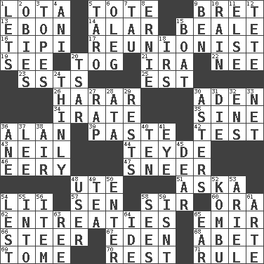 ACROSS 1. Globular water bottle used in Asia 5. Carryall 9. Cy Young winner Saberhagen 13. Inky black, to poets 14. Having or resembling wings 15. Calif. Air Force Base 16. Native american tent (variation) 17. One who advocates reunion 19. Perceive with the eye 20. Coat; cloak 21. Retirement account (abbr.) 22. Born 23. Fast planes 25. Eastern Standard Time (abbr.) 26. Ethiopian city, capital of Harari 30. An important port of Yemen 34. Feeling or showing extreme anger 35. Trig term 36. Actor Alda or Thicke 39. Thick mixture 42. Trial 43. Famous astronaut Armstrong 44. Miss Universe 1986, Barbara Palacios _ 46. Suggestive of the supernatural 47. Scornful expression 48. Shoshoni 51. "____ silly question..." 54. Cards in a Roman deck? 57. Elected rep. 58. Title for a knight 60. Mouth or opening 62. Pleas 65. Arab leader 66. Navigate 67. Genesis locale 68. Collude with 69. Heavy book 70. Repose 71. Governing power DOWN 1. Allows 2. Off-Broadway awards 3. Drinks excessively 4. Black tropical American cuckoo 5. Pacific island yam 6. Cassini of fashion 7. The 19th letter of the Greek alphabet 8. Bert's buddy 9. Benjamin's nick name 10. Water falling in drops from the sky 11. Otherwise 12. False hair 15. Water vessel 18. Big collection agency 20. Russian ruler of old 24. Without viscosity 27. Hit sharply and swiftly 28. _ moment's notice (2 wds.) 29. Musical pauses 30. Michaelmas daisies 31. Expire 32. Followers of ems 33. Remaining after all deductions 36. A saturated hydrocarbon 37. Area sheltered from the wind 38. Wind 40. Nine, plus one 41. Sight organ 45. Letter starter 48. One who makes use of a thing 49. Beverage made from leaves 50. Keyboard key 52. Dried seaweed eaten as food 53. Satellite of Uranus 54. For fear that 55. To the inside or interior of 56. A distinct part 58. Perceives with the eye 59. Is not 61. Johnson of "Laugh-In" 63. Portuguese money of account (variant) 64. Binary compound 65. Hearing organ