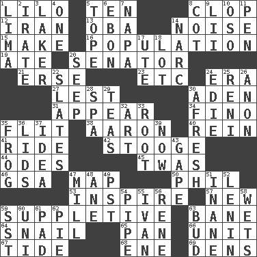 ACROSS 1. _ and Stitch 5. Nine, plus one 8. Hoof sound 12. SW Asia republic 13. Chief or king in Benin or Nigeria 14. Annoying sound 15. Cause to be 16. Census information 19. Had dinner 20. Legislator 21. Celtic language 23. And so on (abbr.) 24. Period 27. For fear that 30. An important port of Yemen 31. Seem 34. A pale, very dry sherry 35. Sudden quick movement 38. Composer Copland 40. It's straight from the horse's mouth 41. Travel on an animal 42. Moe Howard, for one 44. Lyric poems 45. It was, poetically 46. Girls' org. (abbr.) 47. Atlas unit 50. Silvers or Donahue 53. Motivate 57. ___ Haven, CT 59. Supplementary 63. Object of repulsion 64. Slow-paced one 65. Baking dish 66. A single undivided whole 67. Event that recurs at intervals 68. Compass dir. 69. Lairs DOWN 1. Pale green bean 2. Feeling or showing extreme anger 3. Member of a famous L.A. basketball team 4. Single 5. Drink excessively 6. Inky black, to poets 7. California wine valley 8. Small bed 9. Cards in a Roman deck? 10. Bear (Spanish) 11. Animal enclosure 14. Drug cop 17. Shoshoni 18. Car dealer's back yard 20. Ooze 22. Chalkboards 24. Singer Brickell 25. Painter Guido (1575-1642) 26. At once, immediately (arch.) 28. Health resort 29. Beverages made from leaves 30. Anew 32. Nonscientific branch of learning 33. Carrot, for example 35. Tree-dwelling hopper 36. Flaplike coverings 37. It may be bright or harebrained 39. Immediately 43. Open wide 47. Place where flour is made 48. One (Scot) 49. Pacific Standard Time (abbr.) 51. Silly 52. Soviet premier 1918-24 54. Corncob 55. _ the terrible 56. French philosopher Descartes 58. Soaks 59. Fast jet (abbr.) 60. Single; one (prefix) 61. Writing tablet 62. Sliced dessert 63. Partially opened flower