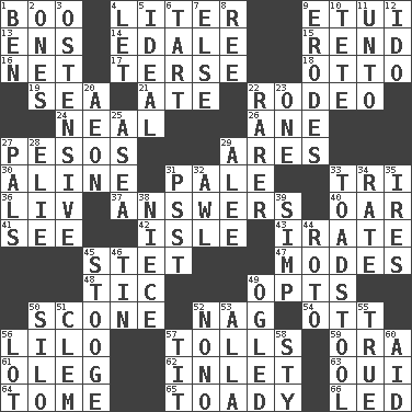 ACROSS 1. Surprise greeting 4. 61 cubic inches 9. Needle case 13. Followers of ems 14. Peak District village in England 15. Tear apart 16. Fish or hair follower 17. Laconic 18. "Beetle Bailey" pooch 19. Ocean 21. Had dinner 22. Cowboy competition 24. Anneal 26. One (Scot) 27. Mexican monetary units 29. Ancient Greek god of war 30. Place in a line 31. Light colored 33. Three (prefix) 36. 54 in ancient Rome 37. Responses 40. Boat paddle 41. Perceive with the eye 42. Capri or Wight 43. Feeling or showing extreme anger 45. Proofreading order 47. Methods 48. Nervous spasm 49. Chooses 50. Biscuitlike quick bread 52. Tired old horse 54. Baseball player Mel 56. _ and Stitch 57. For Whom the Bell _____ 59. Mouth or opening 61. Cassini of fashion 62. An arm off of a larger body of water 63. Fr. "Yes" 64. Heavy book 65. Sycophant 66. Directed DOWN 1. Benjamin's nick name 2. Singles 3. Clearly or manifestly demonstrative 4. Allow 5. Perfect 6. Small pie 7. Otherwise 8. To sift 9. Eats (away) 10. Wig 11. To (old English) 12. Wedding promise 20. Period of immesurable duration 22. More valued for its uncommonness 23. Single 25. At sea 27. Friends 28. Writer Wiesel 29. Toward shelter 31. Inconspicuous attention getter 32. Leather borer 33. Inedible or poisonous agaric 34. Assign a rank or rating to 35. Angers 38. Sibling's daughter 39. Simple or foolish person 44. Printing process, for short 45. Moe Howard, for one 46. Shallow baking pan 49. Stared at amorously 50. Grain storage tower 51. Clement's nick name 52. Words to Nanette 53. Silent film actress Nazimova 55. Loyal 56. Car dealer's back yard 57. Teat (slang) 58. Filthy place 60. Help