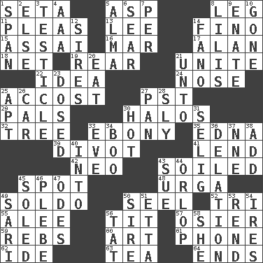 ACROSS 1. Bristle 5. Viper 8. Part of a journey 11. Entreaties 13. Area sheltered from the wind 14. Fine (Spanish) 15. Slender Brazilian palm 16. Make imperfect 17. Actor Alda or Thicke 18. Fish or hair follower 19. Posterior 21. Join together 22. It may be bright or harebrained 24. Sense of smell 25. Buttonhole 27. Pacific Standard Time (abbr.) 29. Friends 30. Saint headwear 32. Woody plant 33. Black 35. Pulitzer Prize-winning author Ferber 39. A piece of turf (Scot.) 41. Grant temporary use of 42. Modern: prefix 43. Dirtied 45. Specific locale 48. Capital and largest city of Mongolia 49. Twentieth part of a lira 50. Sew up the eyelids of hawks and falcons 52. Three (prefix) 55. Toward shelter 56. Teat (slang) 57. Flexible twig of a willow tree 59. Confederate soldiers (slang) 60. Nonscientific branch of learning 61. Give a jingle 62. Binary compound 63. Beverage made from leaves 64. Conclusions DOWN 1. Connect, as a bridge 2. Otherwise 3. A testis 4. Auto club (abbr.) 5. _ mater 6. Dry up 7. For each 8. Ms. Damita and namesakes 9. Related on the mother's side 10. Went 12. Titles for men of rank and authority 14. Papal veil 20. Consume 21. To (old English) 23. Administered medicine 25. Fitting 26. 4-wheeled motor vehicle 27. Baking dish 28. Wily 30. Being at a high temperature 31. Former Milwaukee Brewers owner Bud 33. Night before a holiday 34. Surprise greeting 36. Conveyance 37. Compass dir. 38. Find the sum of 40. To the inside or interior of 43. Take to court 44. Fourth or lowest deck 45. Having a sole or soles 46. First-year military academy student 47. Lyric poems 49. Indian skirt 50. Beget 51. Singer James 53. Tear apart 54. Angers 56. Make lace 58. A female animal or person