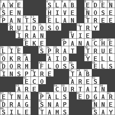 ACROSS 1. Deep reverence 4. Thick slice 8. Paradise 12. Elected rep. 13. Hub of activity 14. Sense of smell 15. Leg coverings 18. Liveliness 19. Woody plant 20. Boisterous (Brazilian Portuguese) 22. Attempt to accomplish something 23. SW Asia republic 24. Compete 25. Supplement with great effort 26. Flamboyance 30. Whopper 33. Small fatty European fish 36. Loyal 37. Gumbo ingredient 39. Assist 40. Shout 41. Dormintory (informal) 42. Soft thread for cleaning between teeth 44. Raised railways 45. Stimulate to action 47. Bar bill 50. Environmental prefix 51. Ancient Greek god of war 53. "We ___ not amused" (Victoria) 54. Window treatment 57. Inactive volcano in Sicily 59. Friends 61. _ Allan Poe 63. To draw with force 64. Fastener 65. Compass dir. 66. Filth; sediment 67. Scottish caps 68. Declare DOWN 1. Cleo's killer 2. Put on (as clothing) 3. World-weariness 4. "______ My Girl" (Turtles hit) 5. _ and Stitch 6. Actress Gardner 7. Benjamin's nick name 8. Plea 9. Small, narrow, flatbottom fishing boat 10. Compass dir. 11. Born 16. Hoop that covers a wheel 17. Neighbor of Neb. 21. Washington bills 22. Shallow baking pan 24. Large container 26. Groovy apts. 27. Algonquian 28. Frame or body of a ship 29. Snakelike fish 30. Farming town in central California 31. Picture 32. Blunders 34. Light colored 35. _ de Janeiro 38. Electrical Measurement 42. Away 43. Play the lead 46. Frozen water 48. Johnson of "Laugh-In" 49. Necklace unit 52. Omens 53. Of or related to the anus 54. Burrowing marine mollusk 55. United States Postal Service (abbr.) 56. Grandmother 57. Begley and Asner 58. Three (prefix) 59. Pacific Standard Time (abbr.) 60. Santa ___, CA 62. Marina Del _, California