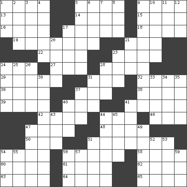 ACROSS 1. In addition 5. Docile 9. Petroleums 13. Grandmother 14. Enthusiasm 15. Indian titles of respect 16. The front part of a cuirass 17. Declaim 18. Drink excessively 19. Orator 21. Layer 22. Set of matching outer garments 23. Baking dishes 24. Pacific Standard Time (abbr.) 27. Area sheltered from the wind 28. Beer foam 29. Toward the future 31. French article 32. _ the terrible 36. Hiding places for outlaws 37. Lair 38. Grand slam 39. Fast planes 40. Tired old horse 41. Exchanges for money 42. Picture 44. Ripen 46. Make lace 47. Russian ruler of old 48. Soup holder 50. Baseball player Mel 51. Simpletons 54. Stalk of a moss capsule 56. Eat (away) 58. Smile enhancers 60. Northwest Algerian city 61. Quote 62. Son of Isaac 63. Table seasoning 64. Wrote a lyric poem 65. Wig DOWN 1. A saturated hydrocarbon 2. Falls behind 3. Clip 4. Fertile tracts in a desert 5. Cylindrical with tapered ends 6. Having or resembling wings 7. Floor protector 8. Compass dir. 9. Clearly or manifestly demonstrative 10. Metal shackles 11. Mouth edge 12. Compass dir. 17. Migrant worker of the '30s 20. Old (Scot.) 21. Possessed 23. Product of festering 24. Writing tablets 25. "______ My Girl" (Turtles hit) 26. Portable shelter 28. Elected rep. 30. Aide 31. Part of a journey 33. Electrical Unit 34. Silent film actress Nazimova 35. Egg locale 37. Daniel's nick name 40. Not either 41. Stitched 43. Krazy ___ of comics 44. Tolerated 45. Went 47. "_____ Recall" 49. It is permitted: Lat. 51. Make mention of 52. Relaxation 53. Petty quarrel 54. Distress signal 55. Epoch 56. Environmental prefix 57. To free from 59. Institute legal proceedings