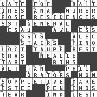 ACROSS 1. Nathan's nickname 5. Enemy 8. Indonesian resort city 12. Angers 13. Nanny (var.) 14. One who wires 15. Introduce or present, as a question 16. Dwellings 19. Fast jet (abbr.) 20. Commissioned military rank 21. Son of Isaac 23. Leather borer 24. Double-curved letter 27. Fast planes 30. Actor Baldwin 31. Flight of steps 34. A pale, very dry sherry 35. Event scenes 38. Grayish beige 40. Repose 41. Mouths or openings 42. Ear of corn 44. Small pie 45. Basketball hoops 46. The first octave above the treble staff 47. Scottish cap 50. Silvers or Donahue 53. Speakers 57. Immediately 59. Supplying deficiencies 63. Female horse 64. First name in cosmetics 65. Writing instrument 66. Conclusions 67. Pull into pieces 68. Working for oneself (abbr.) 69. For fear that DOWN 1. Pinches, bites 2. Came up 3. Trials 4. Compass dir. 5. Conductor's collection 6. Sign of something about to happen 7. Relaxation 8. Storage container 9. Curve 10. Area sheltered from the wind 11. Big collection agency 14. Not ill 17. Retirement account (abbr.) 18. Simpleton 20. Abrupt rush of wind 22. Help 24. Writer Wiesel 25. Elected reps. 26. Native of Scotland 28. Make lace 29. Thailand, formerly 30. Anew 32. Sorrow 33. Practice fight 35. Globular water bottle used in Asia 36. Spoken 37. Draw slowly or heavily 39. Connecticut Ivy Leaguer 43. Naughty children 47. Lacquered or enameled metalware 48. "We ___ not amused" (Victoria) 49. Floor protector 51. Lacking in sense or substance 52. Domineers 54. Native american tent (variation) 55. Baking chamber 56. Tear apart 58. Compass direction 59. Arrange properly for use 60. Purpose 61. Parent Teacher Assoc. 62. For each 63. Cartoonist voice _ Blanc