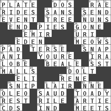 ACROSS 1. Food holder 6. Two (Sp.) 9. Actress Charlotte 12. Amusement-park features 13. Without 14. Post 15. Incident 16. Woody plant 17. Religious women 18. Conclude 19. Sliced desserts 20. Went 21. Independent ruler or chieftain 23. RI univ. 24. Locale of original sin 25. Catcalls? 28. Writing tablet 30. Laconic 34. Fastener 35. Cuckoo 36. You are 38. Retirement account (abbr.) 39. Ear part 41. Calif. Air Force Base 43. Fast jet (abbr.) 44. Promenades 46. Stupid person 48. Biblical high priest 49. French philosopher Descartes 50. Sever or remove by pinching or nipping 51. Den 53. Compass dir. 56. Margarine 57. Saudi Arabian king (1953-1964) 58. Sycophant 60. Relief 61. Cause heat under the collar 62. Nick name for Arthur 63. Music discs 64. Working for oneself (abbr.) 65. Confronts DOWN 1. Before (prefix) 2. Moving, as bait 3. An important port of Yemen 4. Looked after 5. Eastern Standard Time (abbr.) 6. Have the gumption 7. Singles 8. Compass dir. 9. One who advocates reunion 10. Singer Murray 11. Begley and Asner 13. Agitate 14. Sounds asleep 19. Abounding in pines 20. Chewing product 22. Was introduced to 24. The property of being fit to eat 26. Armed conflicts 27. Argument over a trivial matter 28. Inside of hand 29. Small Philippine buffalo 31. Director Reiner 32. Take to court 33. Period 37. A person who is older than you are 40. American author Paul (1891-1958) 42. A really long time 45. Small drink 47. Poe poem 49. Travel on an animal 50. Downhill vehicle 51. (Had) reclined 52. Old (Scot.) 54. Nathan's nickname 55. Prepare for publication 56. The grampus (Milton) 57. _ Lanka 58. Scottish cap 59. It is so