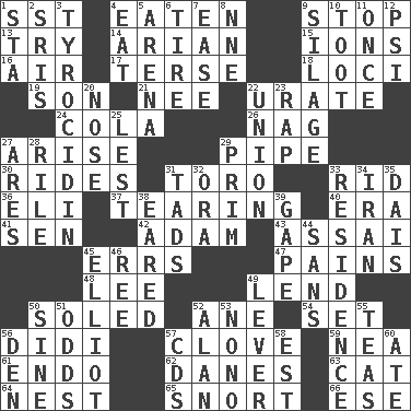 ACROSS 1. Fast jet (abbr.) 4. Eroded 9. Close up, plug up 13. Attempt 14. Believer in; advocate of (suffix) 15. Charged particles 16. Wind 17. Laconic 18. Venues 19. Male offspring 21. Born 22. A salt of uric acid 24. Root beer relative 26. Tired old horse 27. Get up 29. Corncob 30. Amusement-park features 31. "Corrida" creature 33. To free from 36. Biblical high priest 37. Pulling into pieces 40. Period 41. Elected rep. 42. First of billions? 43. Slender Brazilian palm 45. Blunders 47. Aches 48. Area sheltered from the wind 49. Grant temporary use of 50. Having a sole or soles 52. A saturated hydrocarbon 54. Put into a specified state 56. "You Light Up My Life" star Conn 57. Garlic unit 59. Teachers' org. 61. Inside; within (prefix) 62. Natives or inhabitants of Denmark 63. Feline 64. Egg locale 65. Derisive sound 66. Compass dir. DOWN 1. R.R. building 2. Indian titles of respect 3. Polypeptide antibiotic 4. Erode 5. Sports stadium 6. Hoop that covers a wheel 7. Relaxation 8. Compass dir. 9. Fodder prepared in a silo 10. A blast of a horn 11. At one time in the past 12. Air pressure measure (abbr.) 20. Sense of smell 22. The state of being joined or united 23. Strike 25. For fear that 27. Ancient Greek god of war 28. Cause heat under the collar 29. Demure 31. Small amounts or degrees 32. Mouth or opening 33. Dwelling 34. SW Asia republic 35. Raised platform 38. Having ears or earlike features 39. Open wide 44. Without 45. American author Paul (1891-1958) 46. To sift 49. Crowbar 50. Trig term 51. Probability 52. Actor Alda or Thicke 53. Words to Nanette 55. Beverages made from leaves 56. Lair 57. Music discs 58. Eastern Standard Time (abbr.) 60. Had dinner