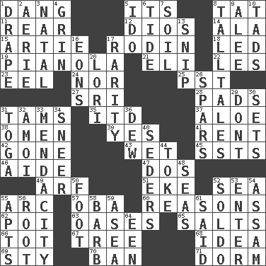 ACROSS 1. Mild oath, euphamism for damn 5. ___ a Wonderful Life 8. Make lace 11. Bring up, as a child 12. "Vaya con ____" 14. Wing 15. Nick name for Arthur 17. "The Thinker" sculptor 18. Directed 19. Player piano 21. Connecticut Ivy Leaguer 22. French article 23. Snakelike fish 24. And not 25. Pacific Standard Time (abbr.) 27. _ Lanka 28. Groovy apts. 31. Scottish caps 35. It would 37. _ vera 38. Presage 39. Consenting reply 41. Monthly bill 42. Went 43. Soggy 45. Fast planes 46. Assistant 47. Two (Sp.) 49. Sandy's bark 51. Supplement with great effort 52. Ocean 55. Curve 57. Chief or king in Benin or Nigeria 60. Thinks logically 62. Luau course 63. Fertile tracts in a desert 65. Table seasonings 66. Small child 67. Woody plant 68. The main thing one is thinking about 69. Filthy place 70. Bar 71. Dormintory (informal) DOWN 1. Window treatment 2. Nest on high 3. Brizilian seaport 4. Amused look 5. Wedding promise 6. Periodic rise and fall of the sea level 7. The visible part of the earth's surface 8. Baron Munchausen's specialties 9. Toward shelter 10. Small boys 13. Clip 16. Immeasurably long periods of time 17. Noteworthy scarcity 20. Australian parrot (variant) 26. Practice fights 29. Do not 30. Arranges properly for use 31. Ancient Roman robe 32. Mine, in Marseilles 33. Ananias' fault 34. Contemptuous expression 36. Morning condensation 40. Spring feasts 44. Puff or smoke 48. Oceans 50. 12 inches 52. Twentieth part of a lira 53. Keyboard key 54. Indian state 55. Flats, for short 56. Carrot, for example 58. Sharp remark 59. Toward the sea 61. Alleged 64. Car or cant ending