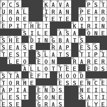 ACROSS 1. Personal Computers (abbr.) 4. Polynesian shrub of the pepper family 8. Pacific Standard Time (abbr.) 11. Mountain range 13. SW Asia republic 14. Lightbulb-shaped fruit 15. Old wives' tales, e.g. 16. Wig 17. Von Bismarck 18. Curse 21. Japanese brewing company 22. Filth; sediment 23. White ___ sheet 25. Single 26. A female animal or person 29. Empty-headed or silly people 32. Gospel singer Marvin 34. Strike 35. Double-curved letter 38. Trial 39. Narrow boards 41. Native american tent (variation) 43. Lion 44. A really long time 45. More valued for its uncommonness 46. One to whom something is allotted 50. Begley and Asner 51. R.R. building 54. Newt 55. Parka part 57. Singer Mel 59. Gist 63. Capital of Western Samoa 64. Conclusions 67. Famous astronaut Armstrong 68. For fear that 69. Went 70. Suttee (variant) 71. Compass dir. 72. Pate de foie ____ 73. Potassium hydroxide DOWN 1. Whimper 2. Riding implement 3. Indian skirt 4. Baby cat 5. "We ___ not amused" (Victoria) 6. Large container 7. A saturated hydrocarbon 8. Stone: prefix 9. Smooth fabric 10. Marketplace scale 12. Allows 14. Luau course 19. Flintstone garb 20. Connecticut Ivy Leaguer 21. Krazy ___ of comics 23. Blind as ____ 24. Plant excrements 26. Fast jet (abbr.) 27. The bottom of a shoe or boot 28. Relaxation 30. Let have 31. Stalk of a moss capsule 33. Portico 36. Male parent of an animal 37. Broke a traffic law 39. Automatic 40. Plunder 42. Big collection agency 45. Vintage cars 47. Area sheltered from the wind 48. College papers 49. Greek goddess of the dawn 51. Lacking originality or spontaneity 52. Drinks excessively 53. Ascend 56. Cub Scout units 58. Floor covering 60. Actress Patricia 61. Municipality 62. Writer Wiesel 64. Oval reproductive body of a fowl 65. And not 66. Heredity factor (abbr.)