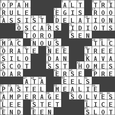 ACROSS 1. Brightly colored fish 5. The first octave above the treble staff 8. Three (prefix) 11. Governing power 12. The front part of a cuirass 13. Friend of Pooh 14. Aid 17. Accusation by an informer 19. Motion picture awards 21. Foolish or stupid persons 22. "Corrida" creature 23. Elected rep. 24. Big _ 27. Common sense 29. Affectionate concern, for short 32. Declaim 34. Born 36. Family _ (genealogy) 37. Grain storage tower 38. One of the 12 tribes of Israel 39. Polynesian shrub of the pepper family 40. Highlander 41. Fast jet (abbr.) 42. Dwellings 43. Rowing implement 44. Celtic language 46. Before (prefix) 47. _ moment's notice (2 wds.) 50. Snakelike fish 52. Soft color 55. Ear of corn 57. Electrical Measurement 59. Finds the solution 62. Area sheltered from the wind 63. Proofreading order 64. Louse (plural) 65. Conclusion 66. Car or cant ending 67. Narrow opening DOWN 1. Mouth or opening 2. Fluid product of inflammation 3. In addition 4. Robbery 5. Grow older 6. Ms. Damita and namesakes 7. Sadhe (variant) 8. Musical group of three 9. Carrot, for example 10. Charged particles 12. Begley and Asner 15. Biscuitlike quick bread 16. Edible starchy tuberous root 18. Metal container 20. Periods in a boxing match 24. With motion or animation 25. N. Chile seaport 26. Bodily heat indicating an inflammation 28. Gospel singer Marvin 29. _____ steamer (cargo ship) 30. Prying instrument 31. Stop 33. Small child 35. Main course 36. Ring climax 42. Phone greeting 45. Oceans 47. Had dinner 48. Laconic 49. Having winglike extensions 51. Beverly of Met fame 52. Light colored 53. So be it 54. Broke a traffic law 55. Was introduced to 56. Morally bad or wrong 58. Commissioned mil. rank 60. Environmental prefix 61. Put into a specified state