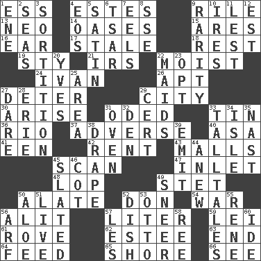 ACROSS 1. Double-curved letter 4. _____ Park, CO 9. Cause heat under the collar 13. Modern: prefix 14. Fertile tracts in a desert 15. Ancient Greek god of war 16. Ewer handle 17. Showing deterioration from age 18. Take ten 19. Filthy place 21. Big collection agency 22. Wet 24. "Terrible" tsar 26. Fitting 27. Prevent from occurring 29. Municipality 30. Originate 31. Wrote a lyric poem 33. Metal container 36. River (Sp.) 37. Contrary to your interests or welfare 40. White ___ sheet 41. Car or cant ending 42. Monthly bill 43. Promenades 45. Examine hastily 47. An arm off of a larger body of water 48. Chop off 49. Proofreading order 50. Having winglike extensions 52. Spanish title 54. Armed conflict 56. Came down and settled, as after flight 57. 61 cubic inches 59. Luau accessory 61. Be footloose 62. First name in cosmetics 63. Conclusion 64. Nourish 65. Dinah or Pauly 66. Observe DOWN 1. Compass dir. 2. Oceans 3. Drawing lots 4. Greek goddess of the dawn 5. Smooth fabric 6. Russian ruler of old 7. Snakelike fish 8. Compass dir. 9. Noteworthy scarcity 10. Angers 11. For fear that 12. Eastern Standard Time (abbr.) 20. Jacques Cousteau's middle name 22. Women servants 23. Elect 25. Type of rug 27. Have the gumption 28. One of the Great Lakes 29. Sure thing 31. Baking chamber 32. Lair 33. Baron Munchausen's specialties 34. Small island 35. Political cartoonist Thomas 38. Window treatment 39. Give off 44. Afresh 45. Scheduled 46. Small bed 49. Scornful expression 50. Medicinal plant 51. Not recorded 52. Food container 53. "Beetle Bailey" pooch 55. French philosopher Descartes 56. Sandy's bark 57. French article 58. To sift 60. Binary compound