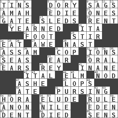 ACROSS 1. Metal containers 5. Small, narrow, flatbottom fishing boat 9. Settles 13. Wet nurse 14. Singer Brickell 15. Washington bills 16. Yard entry 17. Bobsleighs 18. Monthly bill 19. Felt deep pity or tenderness 21. Call ___ day 22. Pick up the tab 23. Use a spoon 24. Consume 27. Deep reverence 28. Political cartoonist Thomas 29. Indian state 31. Police officer (slang) 32. Charged atoms 36. Oceans 37. Hearing organ 38. Of the mouth 39. Hearing organs 40. Marina Del _, California 41. Lacking in sense or substance 42. Slanted text style (abbr.) 44. Shade tree 46. Allow head to fall sleepily 47. American tennis player Robert 48. Chops off 50. Had dinner 51. Puckering 54. Israeli folk dance 56. Evade 58. Governing power 60. Soon (poet.) 61. Mediterranean tributary 62. Paradise 63. Undesirable depression on a surface 64. Passed on 65. Elected reps. DOWN 1. Label 2. "If ____ say so..." 3. Nathan's nickname 4. Bundle of cut stalks of grain 5. Keyboard key 6. Wrote a lyric poem 7. To free from 8. It is so 9. Drawing lots 10. Approach 11. Commissioned mil. rank 12. Fast jet (abbr.) 17. Frozen precipitation 20. Wander aimlessly 21. It is 23. Plant excrement 24. Relaxation 25. At sea 26. Russian ruler of old 28. Not either 30. Aide 31. Island 33. Northwest Algerian city 34. Billionth: prefix 35. Downhill vehicle 37. Snakelike fish 40. Actress Charlotte 41. Naughty children 43. Definite Article 44. Dodged 45. Old wives' tales, e.g. 47. Composer Copland 49. Titles for men of rank and authority 51. Whimper 52. Naked 53. Small, secluded valley 54. Possessed 55. Single 56. Conclude 57. Cards in a Roman deck? 59. Followers of ems