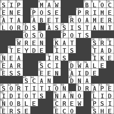 ACROSS 1. Small drink 4. Opening into something insatiable 7. Alliance 11. Compass dir. 12. Introduce or present, as a question 13. A-one 14. _ moment's notice (2 wds.) 15. Collude with 16. Wanderer 17. Nobles 19. Helper 21. Bear (Spanish) 23. Plant holders 24. Songbird 25. Krazy ___ of comics 26. _ Lanka 29. Miss Universe 1986, Barbara Palacios _ 30. It is 31. Bit 32. Teachers' org. 33. Big collection agency 34. Mamie's mate 35. Hearing organ 36. _-fi 37. A sleeping potion; an opiate (poet.) 40. Double-curved letter 41. Car or cant ending 42. Helper 43. Glance over 45. Heredity factor (abbr.) 46. Drawing lots 51. Window treatment 55. Foolish or stupid persons 56. Billionth: prefix 58. Flaplike covering 59. Having high moral qualities 60. Ship's personnel 61. 23rd letter of the Greek alphabet 62. Celtic language 63. Environmental prefix 64. A female animal or person DOWN 1. Lick closed 2. To the inside or interior of 3. Lightbulb-shaped fruit 4. Crowd into 5. At sea 6. Moistens 7. Naughty children 8. Pale green bean 9. Sign of something about to happen 10. Foregone conclusion 12. Went by 13. Mail 16. Disturbances 18. Rowboat 20. Arguments over trivial matters 22. Single 24. Puts on (as clothing) 25. Japanese brewing company 26. Vertical member of a panel or frame 27. Libertine 28. Binary compound 29. Afternoon social gatherings 32. Born 33. Ancient Celtic tribe of eastern Britain 36. Theater features 37. Male parent 38. Light entry point 39. The sixth month of the Jewish calendar 43. Fur scarf 44. Quote 46. Trig term 47. Aroma 48. Teases 49. Single time 50. Drug cop 52. High mountains 53. Expression of disdain 54. Singer Brickell 57. Modern: prefix