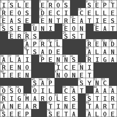 ACROSS 1. Small island 5. Greek god of love 9. Back-to-school mo. 13. Vintage cars 14. Tenth: prefix 15. Cell (Danish) 16. Relaxation 17. Pleas 19. Compass dir. 20. Single; one (prefix) 21. Period of immesurable duration 22. Erode 23. Blunders 25. Fast jet (abbr.) 26. Showery time 30. Tear apart 34. Sadhe (variant) 35. Actor Alda or Thicke 36. Mountain range southwest of Kyrgyzstan 39. Actor Sean's family 42. Capital of Latvia 43. Western Nevada city 44. Ancient Celtic tribe of eastern Britain 46. Adolescent 47. Music written for nine 48. Plant excrement 51. Synchronize (abbr.) 54. Bear (Spanish) 57. Petroleum 58. Feline 60. American Automobile Association (abbr.) 62. Complicated, petty procedures 65. Move through with a circular motion 66. Approach 67. Prong on a fork 68. Small pie 69. Ooze 70. Stalk of a moss capsule 71. _ vera DOWN 1. Angers 2. Gospel singer Marvin 3. Failure 4. Compass dir. 5. Genesis locale 6. Painter Guido (1575-1642) 7. Sep. follower 8. Titles for men of rank and authority 9. Put into a specified state 10. Writer Wiesel 11. Entreaty 12. Trial 15. Patter 18. Greek goddess of the dawn 20. United States Postal Service (abbr.) 24. Food allowance for one day 27. Strike 28. Binary compound 29. Soviet premier 1918-24 30. Noteworthy scarcity 31. Connecticut Ivy Leaguer 32. Tired old horse 33. Heredity factor (abbr.) 36. Nonscientific branch of learning 37. Area sheltered from the wind 38. A saturated hydrocarbon 40. Non-commissioned officer (abbr.) 41. Elected rep. 45. Egg locale 48. Fly high 49. Wind 50. Graphs 52. Brizilian seaport 53. Capital of Egypt 54. Mouths or openings 55. Trig term 56. Double curve, resembling the letter S 58. Penny 59. Toward the sea 61. Johnson of "Laugh-In" 63. Atlas unit 64. Falsehood 65. R.R. building