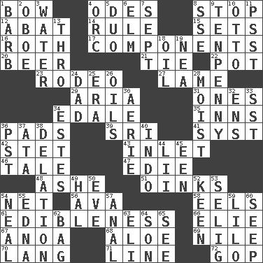 ACROSS 1. Arrow shooter 4. Lyric poems 8. Obstruct or block passage 12. Blind as ____ 14. Court order 15. Arranges properly for use 16. Writer of Portnoy's Complaint (1969) 17. Pieces 20. Fermented drink made from hops 21. Standoff 22. Plant holder 23. Cowboy competition 27. Unable to walk 29. Roberta Peters solo 31. Singles 34. Peak District village in England 35. Lodging establishments 36. Writing tablets 39. _ Lanka 41. System (abbr.) 42. Proofreading order 43. An arm off of a larger body of water 46. Falsehood 47. Singer Brickell 48. American tennis player Robert 51. Pig sounds 54. Fish or hair follower 56. Actress Gardner 58. Snakelike fish 61. The property of being fit to eat 66. Writer Wiesel 67. Small Philippine buffalo 68. _ vera 69. Mediterranean tributary 70. Austrian-born American filmmaker Fritz 71. Actor's bit 72. Republican Party DOWN 1. Sharp remark 2. Mitch Miller's instrument 3. Wetness 4. The grampus (Milton) 5. Superhero pair 6. Shade tree 7. Back-to-school mo. 8. Compass dir. 9. 3-inch nail 10. "Beetle Bailey" pooch 11. Inconspicuous attention getter 13. Through, poetically 18. Petroleum 19. Teachers' org. 24. Male parent 25. Period 26. Petroleums 28. Damp 30. Nest on high 32. Followers of ems 33. Fast jet (abbr.) 34. _____ Park, CO 36. Pacific Standard Time (abbr.) 37. _ moment's notice (2 wds.) 38. Conveyance 40. _ china 44. Cards in a Roman deck? 45. Car or cant ending 49. Actor Linden 50. First lady 52. Peachy ____! 53. Major League Baseball Commissioner Bud 54. Be tempered by heat 55. Pulitzer Prize-winning author Ferber 57. Of or related to the anus 59. _ and Stitch 60. Ooze 62. Paper or plastic container 63. Biblical high priest 64. Manchild 65. Observe