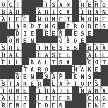ACROSS 1. Sep. follower 4. Russian ruler of old 8. San ____ (Riviera town) 12. Oblong piece of solid material 13. N. Chile seaport 14. SW Asia republic 15. Toward shelter 17. Music written for nine 18. Greater amount 19. Preparing or cooking with lard 21. Eats (away) 23. Expire 24. Car or cant ending 26. Compass dir. 27. Sign of things to come 28. Mitch Miller's instrument 30. Indian title of respect (Mr.) 31. College papers 34. Sound made by sheep 37. Actor Linden 38. Artist's stand 39. 100% 40. Pipe bend 41. Greek mezzo-soprano Agnes 42. Small bed 43. Edible starchy tuberous root 44. Cause to be 46. Commissioned military rank (abbr.) 47. Plant excrement 50. Followers of ems 51. A viewer who gazes fixedly 54. Portable computers 57. Heavy book 58. Feeling or showing extreme anger 60. Grandmother 62. Came down and settled, as after flight 63. 61 cubic inches 64. Gear tooth 65. French philosopher Descartes 66. Genesis locale 67. She-sheep DOWN 1. Chief or king in Benin or Nigeria 2. Give a ring to 3. Excercise machine 4. Heavy duty weighing machine 5. Scorch 6. Adept person 7. Pace 8. Full of chinks, cracks, or crevices 9. Wear away 10. Female horse 11. Washington bills 13. Cuckoo 16. 4th largest of the Great Lakes 20. Lair 22. Vintage cars 25. Olfactory organs 27. Spoken 29. Actor Lugosi 30. A female animal or person 31. Pull into pieces 32. Rings 33. Eastern Standard Time (abbr.) 34. Keyboard key 35. _ vera 36. Keyboard modifier key 41. Object of repulsion 43. Cylindrical with tapered ends 44. Was introduced to 45. At once, immediately (arch.) 46. Homeless child 48. Having winglike extensions 49. Eucharist need 51. Play the lead 52. Lacquered or enameled metalware 53. Cause heat under the collar 55. For each 56. Overwhelm 59. To free from 61. Mature