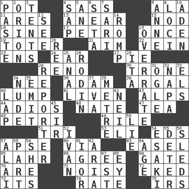ACROSS 1. Plant holder 4. Backtalk 8. According to 11. Ancient Greek god of war 13. Approach 15. Allow head to fall sleepily 16. Trig term 17. Stone: prefix 18. Single time 19. Carrier 21. Direct toward a target or goal 22. Distinctive style or manner 23. Followers of ems 24. Hearing organ 27. Sliced dessert 29. Former U.S. Attorney General Janet 30. Heavy duty weighing machine 34. Born 36. First of billions? 39. Therefore, facetiously 40. Mass 41. Make or become more lively 43. High mountains 44. Goodbye (Sp.) 46. Nathan's nickname 47. Beverage made from leaves 48. _ dish (used to culture cells) 49. Cause heat under the collar 51. Three (prefix) 53. Biblical high priest 54. Begley and Asner 57. Domed church section 60. By way of 63. Artist's stand 65. Cowardly lion portrayer 66. Match 69. Yard entry 70. "We ___ not amused" (Victoria) 71. Annoyingly loud 72. Supplemented with great effort 73. ___ a Wonderful Life 74. Assign a rank or rating to 75. Big collection agency DOWN 1. Thick mixture 2. Greek mythologigal hunter 3. Portable shelters 4. Plant excrement 5. A saturated hydrocarbon 6. Stalk of a moss capsule 7. Indian skirt 8. Singer Murray 9. Locales 10. Arabian gulf 12. Observe 14. Frolic 18. Make much ado about nothing 20. To sift 25. Of or related to the anus 26. "The Thinker" sculptor 28. Call ___ day 29. Newsperson 31. Stare at amorously 32. California wine valley 33. Raised railways 34. Unadorned 35. Give off 37. Actress Gardner 38. Distance measurement (Brit.) 40. Pet locale 42. Famous astronaut Armstrong 45. Title for a knight 50. Whopper 52. "Terrible" tsar 54. 1973 Nobel Price Winner (Physics) Leo 55. Prevent from occurring 56. Bobsleighs 57. Jai ____ 58. Piece 59. "______ My Girl" (Turtles hit) 61. Composer Stravinsky 62. Roberta Peters solo 64. Grow older 67. Eastern Standard Time (abbr.) 68. Sight organ