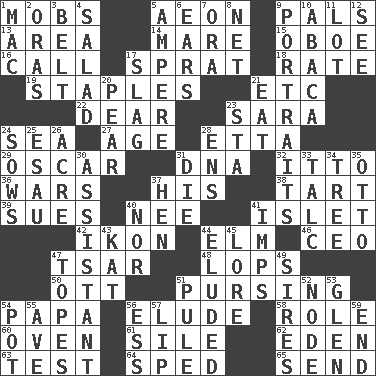 ACROSS 1. Crowds into 5. Period of immesurable duration 9. Friends 13. Type of rug 14. Female horse 15. Mitch Miller's instrument 16. Give a ring to 17. Small fatty European fish 18. Assign a rank or rating to 19. Paper fasteners 21. And so on (abbr.) 22. Letter starter 23. "Two Mules for Sister ____" 24. Ocean 27. Personal question 28. Singer James 29. Motion picture award 31. Heredity factor (abbr.) 32. "Tell ____ the Marines!" 36. Armed conflicts 37. Part of HMS, perhaps 38. Small pie 39. Institutes legal proceedings 40. Born 41. Small island 42. Image 44. Shade tree 46. Corporate head (abbr.) 47. Russian ruler of old 48. Chops off 50. Baseball player Mel 51. Puckering 54. Dad 56. Dodge 58. Hero or heavy, e.g. 60. Baking chamber 61. Filth; sediment 62. Locale of original sin 63. Trial 64. Broke a traffic law 65. Transmit DOWN 1. Big _ 2. Mouths or openings 3. Waist strap 4. Vegetable dish 5. Electrical Unit 6. Hearing organs 7. Mouth or opening 8. Remaining after all deductions 9. Likenesses of persons 10. Phillipine bananalike plant 11. Car dealer's back yard 12. Perceive with the eye 17. Volcanic refuse 20. Lightbulb-shaped fruit 21. Consume 23. R.R. building 24. Sty mamas 25. He sold his birthright 26. 1/640 square mile 28. Followers of ems 30. Helper 31. Pass on 33. Baby powder 34. Woody plant 35. "Beetle Bailey" pooch 37. Layer 40. Not either 41. Naughty children 43. Krazy ___ of comics 44. Dodged 45. Old wives' tales, e.g. 47. Drinks excessively 49. Begets 51. Whine 52. Connecting point 53. Small, secluded valley 54. Plant holder 55. "___ Maria" 56. Double-curved letter 57. Mouth edge 59. Conclusion