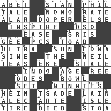 ACROSS 1. Collude with 5. Comedian Laurel of Laurel & Hardy 9. Silvers or Donahue 13. Lie 14. Words to Nanette 15. Assign a rank or rating to 16. Having or resembling wings 17. Drug addict 18. Otherwise 19. Stimulate to action 21. Bear (Spanish) 22. Comfort 23. Indian titles of respect 24. Unit of force equal to gravity 27. Personal Computers (abbr.) 28. Frog relative 29. Extreme 31. Player for Phoenix 32. Pulitzer Prize-winning author Ferber 36. Trig term 37. Definite Article 38. Famous astronaut Armstrong 39. Afternoon social gatherings 40. Supplement with great effort 41. Lacking originality or spontaneity 42. Southeast Asian peninsula 44. Personal question 46. To sift 47. Lyric poems 48. Soup holder 50. Put into a specified state 51. Fools 54. Chow _ 56. Sadhe (variant) 58. (Had) reclined 60. Actor Baldwin 61. Johnson of "Laugh-In" 62. Small island 63. Hoop that covers a wheel 64. Passed on 65. Portico DOWN 1. _ moment's notice (2 wds.) 2. Indonesian resort city 3. Liveliness 4. Laconic 5. Sounds asleep 6. Drink excessively 7. A saturated hydrocarbon 8. And not 9. Elected leader of a country 10. Radiant circles of light 11. It is 12. Area sheltered from the wind 17. Flat circle 20. Dad 21. Mouth or opening 23. Boy, to dad 24. Abrupt rush of wind 25. Writer Wiesel 26. Inactive volcano in Sicily 28. Third day of the wk. 30. Dwelling 31. A female animal or person 33. Letter starter 34. The longest river in the world 35. Toward shelter 37. Ring climax 40. Begley and Asner 41. Stitched 43. Remaining after all deductions 44. Tolerated 45. Went 47. Flexible twig of a willow tree 49. Ms. Damita and namesakes 51. Nathan's nickname 52. Compass direction 53. Grain storage tower 54. Floor protector 55. Biblical high priest 56. Bit 57. Indian title of respect (Mr.) 59. Teachers' org.