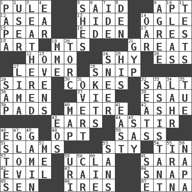 ACROSS 1. Whimper 5. Expressed in words 9. Fitting 12. Toward the sea 13. Flintstone garb 14. Stare at amorously 15. Lightbulb-shaped fruit 16. Locale of original sin 17. Ancient Greek god of war 18. Tate display 19. Mountains (abbr.) 21. Relatively large 22. Like (prefix) 24. Like a shrinking violet 26. Double-curved letter 27. Crowbar 28. Clip 29. Male parent of an animal 30. Popular sodas 32. Table seasoning 36. So be it 37. Compete 38. Son of Isaac 39. Groovy apts. 40. Distance measurement (Brit.) 42. American tennis player Robert 43. Hearing organs 44. Moving about 46. Oval reproductive body of a fowl 49. Choose 50. Backtalk 51. Hits or strikes with great force 53. Filthy place 54. Shallow baking pan 57. Heavy book 58. Southern CA. univ. 61. "Two Mules for Sister ____" 62. Tending to cause great harm 63. Water falling in drops from the sky 64. Fastener 65. Elected rep. 66. Angers 67. Inactive volcano in Sicily DOWN 1. Dad 2. One who makes use of a thing 3. Tough but pliablecoriaceous 4. Ewer handle 5. "______ My Girl" (Turtles hit) 6. Help 7. Binary compound 8. Lair 9. Match 10. Entreaties 11. Trials 14. Boat paddle 19. Madame (abbr.) 20. Torque (variant) 21. Hustle 23. Baking chambers 24. Contemptuous expression 25. Part of HMS, perhaps 27. Pale green bean 28. Burlesque acts 29. Plant excrement 31. Unconcealed 32. Theater features 33. Helper 34. Cowardly lion portrayer 35. Third day of the wk. 40. Atlas unit 41. 90 degrees 43. Greek goddess of the dawn 45. Declare 46. _____ Park, CO 47. Michael Jackson trademark 48. Street urchin 52. Cartoonist voice _ Blanc 53. Without 55. SW Asia republic 56. California wine valley 58. RI univ. 59. 4-wheeled motor vehicle 60. Whopper 61. Compass dir.