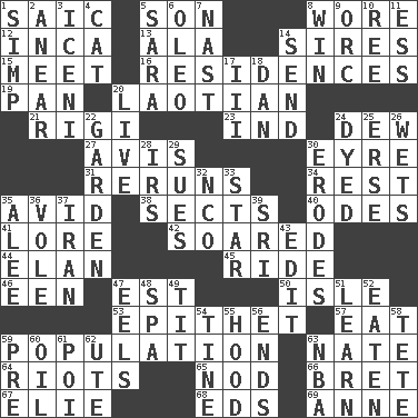 ACROSS 1. Ketch in the Levant 5. Boy, to dad 8. Had on 12. South American Indian 13. Insect wing 14. Founders of families 15. Confront 16. Homes 19. Baking dish 20. Of or relating to Laos or its people 21. Swiss mountan, "Queen of the Mountains" 23. Working for oneself (abbr.) 24. Morning condensation 27. Deliberation 30. Jane of fiction 31. Summer TV shows 34. Repose 35. Enthusiastic 38. Religious groups 40. Lyric poems 41. Old wives' tales, e.g. 42. Flew 44. Flair 45. Travel on or in a vehicle 46. Car or cant ending 47. Eastern Standard Time (abbr.) 50. Small island 53. Curse 57. Erode 59. Census information 63. Nathan's nickname 64. Disturbances 65. Lower and raise head in agreement 66. Cy Young winner Saberhagen 67. Writer Wiesel 68. Begley and Asner 69. Queen of England 1702-14 DOWN 1. Simple or foolish person 2. Approach 3. Ancient Celtic tribe of eastern Britain 4. Feline 5. "Two Mules for Sister ____" 6. Butter sub 7. Political cartoonist Thomas 8. Acquire through effort 9. The grampus (Milton) 10. To separate or throw off 11. Curvy letter 14. Post 17. One more than two 18. Daniel's nick name 20. Moving, as bait 22. Place where plants grow 24. Colored 25. Celtic language 26. Soaks 28. Big collection agency 29. Takes to court 30. Eats (away) 32. Non-commissioned officer (abbr.) 33. Play the lead 35. Toward shelter 36. Grand slam 37. SW Asia republic 39. _ Lanka 43. Prepare for publication 47. Snakelike fish 48. Health resort 49. Teat (slang) 51. Memorize 52. Ingested 54. Prong on a fork 55. Parka part 56. Conclusions 58. False hair 59. Before (prefix) 60. Petroleum 61. Luau course 62. Shoshoni 63. Basketball assoc.