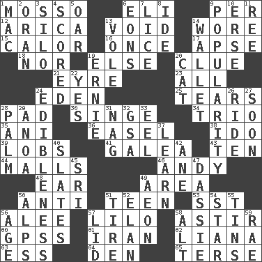 ACROSS 1. With motion or animation 6. Biblical high priest 9. For each 12. N. Chile seaport 13. Null 14. Had on 15. Bodily heat indicating an inflammation 16. Single time 17. Domed church section 18. And not 19. Otherwise 20. A slight indication 21. Jane of fiction 23. Everything 24. Paradise 25. Separates forcefully 28. Groovy apt. 30. Burn superficially 34. Musical group of three 35. Black tropical American cuckoo 36. Artist's stand 38. Wedding promise 39. Tennis shots 41. An organ shaped like a helmet 43. Nine, plus one 44. Shopping centers 46. "60 Minutes" Commentator Rooney 48. Hearing organ 49. Length times width 50. Opposed to 51. Adolescent 53. Fast jet (abbr.) 56. Toward shelter 57. _ and Stitch 58. Having gotten out of bed 60. Global Positioning Systems (abbr.) 61. SW Asia republic 62. Climbing, woody, usually tropical vines 63. Curvy letter 64. Lair 65. Laconic DOWN 1. Apple computer (short form) 2. Northwest Algerian city 3. Grain storage tower 4. Tallied 5. Boat paddle 6. Immeasurably long periods of time 7. Louse (plural) 8. Binary compound 9. Teen's desire 10. Celtic language 11. Portuguese money of account (variant) 13. Grand slam 14. Place for singles 19. Bert's buddy 20. Domesticated feline 22. Affirmative reply 24. The property of being fit to eat 26. Travel on an animal 27. Within a short period 28. Inside of hand 29. Small Philippine buffalo 31. Tired old horse 32. Girls' org. (abbr.) 33. Snakelike fish 37. Acquire or gain knowledge or skills 40. Chalkboards 42. One (Scot) 45. _ Lanka 47. Hyrax 49. Period of immesurable duration 50. High mountains 51. Hoop that covers a wheel 52. Style 54. Play the lead 55. Metal containers 56. Personal question 57. Flaplike covering 58. Keyboard modifier key 59. Actress Charlotte