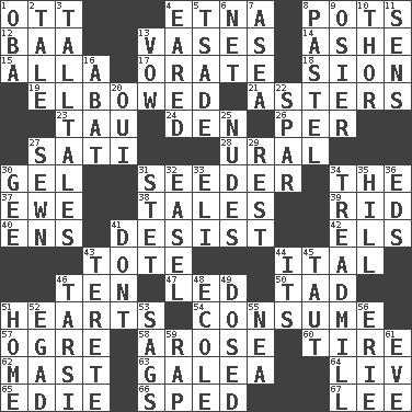 ACROSS 1. Baseball player Mel 4. Inactive volcano in Sicily 8. Plant holders 12. Sound made by sheep 13. Flower holders 14. American tennis player Robert 15. Silent film actress Nazimova 17. Speak pompously 18. The Jewish people; Israel 19. Shoved, as through a crowd 21. Michaelmas daisies 23. The 19th letter of the Greek alphabet 24. Lair 26. For each 27. Suttee (variant) 28. Mountain range 30. Set 31. Sowing specialist 34. Definite Article 37. She-sheep 38. Lies 39. To free from 40. Followers of ems 41. Cease 42. Raised railways 43. Haul 44. Slanted text style (abbr.) 46. "___ Little Indians" 47. Directed 50. Bit 51. Centers 54. Eat 57. Legendary monster 58. Came up 60. Become fatigued 62. Vertical spar for supporting sails 63. An organ shaped like a helmet 64. 54 in ancient Rome 65. Singer Brickell 66. Drove too fast 67. Area sheltered from the wind DOWN 1. Chief or king in Benin or Nigeria 2. Lie 3. Baron Munchausen's specialties 4. Having ears or earlike features 5. Sadhe (variant) 6. Remaining after all deductions 7. Toward the sea 8. Soft color 9. Flexible twig of a willow tree 10. Son of Odin 11. Elected reps. 13. Solemn pledge 16. Blind as ____ 20. Fr. "Yes" 22. Practice fight 25. Unclothed pictures 27. Stitched 29. State of inaction 30. Turn to the right 31. Proofreading order 32. Artist's stand 33. Connecticut Ivy Leaguer 34. Excercise machine 35. Land elevation 36. Begley and Asner 41. Do not 43. Cylindrical with tapered ends 44. It is 45. Pulled tight 46. Tarsus (plural) 48. Learning spot: Fr. 49. Administered medicine 51. Residence 52. Mild oath 53. Settles 55. Teachers' org. 56. 4th largest of the Great Lakes 59. Reproach for some lapse or misdeed 61. First lady