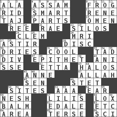 ACROSS 1. In the manner of 4. Indian state 9. Tree-dwelling hopper 13. To free from 14. Don Adams' spy role 15. French philosopher Descartes 16. _ Mahal 17. Pieces 18. Presage 19. Portuguese money of account (variant) 21. Actress Charlotte 22. Grain storage towers 24. Clement's nick name 26. Medical imaging device (abbr.) 27. Having gotten out of bed 29. Flat circle 30. Frees from moisture 31. Calm and collected 33. Small boy 36. HTML Container Element 37. Curse 40. Black tropical American cuckoo 41. Compass dir. 42. Singer James 43. Saint headwear 45. Singer Murray 47. Assad's deity 48. Elected rep. 49. Proofreading order 50. Settings 52. American Automobile Association (abbr.) 54. Hearing organ 56. Delicate 57. Ms. Damita and namesakes 59. Brine-cured salmon 61. Lip ointment 62. Peak District village in England 63. And so on (abbr.) 64. Type of rug 65. Laconic 66. _-fi DOWN 1. Tate display 2. One who doesn't tell the truth 3. Descriptive word 4. Cleo's killer 5. Excessive but superficial compliments 6. "Two Mules for Sister ____" 7. Johnson of "Laugh-In" 8. Mountains (abbr.) 9. Play 10. San ____ (Riviera town) 11. Singles 12. Commissioned mil. rank 20. Writer Wiesel 22. Grin 23. Big collection agency 25. Celtic language 27. Sums up 28. Indian titles of respect 29. Capital of the state of Qatar 31. Quote 32. Baseball player Mel 33. Baron Munchausen's specialties 34. Small Philippine buffalo 35. Food container 38. Actor Sean's family 39. Not this but _ 44. Toward shelter 45. Respiratory problem 46. Born 49. Moves on water 50. Wither 51. Capri or Wight 52. Helper 53. Having or resembling wings 55. College mil. group 56. Basketball assoc. 57. Allow 58. Observe 60. One more than ninety