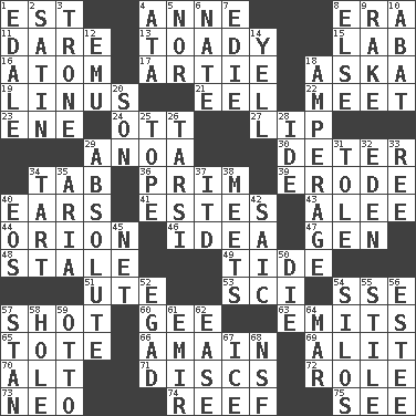 ACROSS 1. Eastern Standard Time (abbr.) 4. Queen of England 1702-14 8. Period 11. Have the gumption 13. Sycophant 15. Experiment locale 16. Smallest unit of an element 17. Nick name for Arthur 18. "____ silly question..." 19. "_ and Lucy" (Charlie Brown theme song) 21. Snakelike fish 22. Rendezvous 23. Compass dir. 24. Baseball player Mel 27. Mouth edge 29. Small Philippine buffalo 30. Prevent from occurring 34. Keyboard key 36. Demure 39. Eat (away) 40. Hearing organs 41. _____ Park, CO 43. Toward shelter 44. Greek mythologigal hunter 46. It may be bright or harebrained 47. Commissioned military rank (abbr.) 48. Showing deterioration from age 49. Periodic rise and fall of the sea level 51. Shoshoni 53. _-fi 54. Compass dir. 57. Went for two points 60. Turn to the right 63. Sends forth 65. Lug 66. At full speed 69. Set down 70. The first octave above the treble staff 71. Plates 72. Hero or heavy, e.g. 73. Modern: prefix 74. Coral ridge 75. Perceive with the eye DOWN 1. Peak District village in England 2. Smooth fabric 3. Heavy duty weighing machine 4. _ moment's notice (2 wds.) 5. And not 6. Nathan's nickname 7. Singer Brickell 8. Otherwise 9. Immoral or dissolute person 10. Blind as ____ 12. Australian flightless bird 14. Shout 18. Electrical Measurement 20. Male child 25. Drink excessively 26. Tarsus (plural) 28. Binary compound 29. Utter; complete 31. Lacquered or enameled metalware 32. Genesis locale 33. Portuguese money of account (variant) 34. Small pie 35. Operatic vocal solo 37. It would 38. Confronts 40. Greek goddess of the dawn 42. Ketch in the Levant 45. Fish or hair follower 50. Expire 52. Mild oath 54. Grain storage towers 55. Vertical member of a panel or frame 56. First name in cosmetics 57. Comedian Laurel of Laurel & Hardy 58. Hollow 59. Von Bismarck 61. Independent ruler or chieftain 62. Comfort 64. Make imperfect 67. Frozen water 68. Overdraft (abbr.)