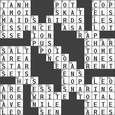 ACROSS 1. Hyperbolic tangent 5. Plant holder 8. Police officer (slang) 11. Mine, in Marseilles 12. Three-handed card game 14. Raised railways 15. Unmarried girls 17. Avian creatures 18. French article 19. Substance 21. White ___ sheet 22. Car dealer's back yard 23. Compass dir. 24. Electrically charged atom 25. Strike 27. Fluid product of inflammation 28. Burn to charcoal 31. Table seasoning 35. Luau course 37. Heavy book 38. Length times width 39. Non-commissioned officer (abbr.) 41. Washington bills 42. Play the lead 43. Period 45. Monthly bill 46. Puts into a specified state 47. Followers of ems 49. Part of HMS, perhaps 51. Chop off 52. Lion 55. "We ___ not amused" (Victoria) 57. Curvy letter 60. Catching in a trap 62. Not either 63. Compose 65. "_____ Recall" 66. "___ Maria" 67. "Death on the ____" 68. False hair 69. Directed 70. Elected rep. 71. Ancient Greek god of war DOWN 1. Softens 2. Collect or gather 3. Annoying sound 4. Flintstone garb 5. 23rd letter of the Greek alphabet 6. Gumbo ingredient 7. Small amounts or degrees 8. Portable communications device 9. Butter sub 10. Inconspicuous attention getter 13. Russian ruler of old 16. Sever or remove by pinching or nipping 17. Gillaume's butler role 20. Overturn; upset 26. Thespian 29. So be it 30. Relief 31. Backtalk 32. Johnson of "Laugh-In" 33. Resembling or made to resemble leather 34. Tarsus (plural) 36. Frozen water 40. Threatening words 44. Soon (poet.) 48. Petty quarrel 50. Stitched 52. 61 cubic inches 53. Maternal 54. Stares 55. Of or related to the anus 56. Be footloose 58. Indian titles of respect 59. Filth; sediment 61. Round or rotation of duties 64. Nine, plus one