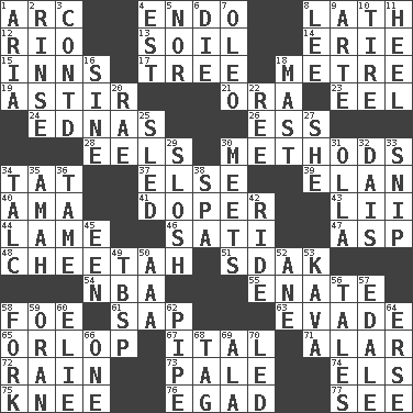 ACROSS 1. Curve 4. Inside; within (prefix) 8. Thin strip of wood or metal 12. River (Sp.) 13. Land 14. 4th largest of the Great Lakes 15. Restaurants 17. Woody plant 18. Distance measurement (Brit.) 19. Having gotten out of bed 21. Mouth or opening 23. Snakelike fish 24. Ferber et al. 26. Double-curved letter 28. Snakelike fish 30. Modes 34. Make lace 37. Otherwise 39. Enthusiasm 40. Nursemaid (var.) 41. Drug addict 43. Cards in a Roman deck? 44. Unable to walk 46. Suttee (variant) 47. Cleo's killer 48. Leopard's kin 51. Neighbor of Neb. 54. Basketball assoc. 55. Related on the mother's side 58. Enemy 61. Plant excrement 63. Dodge 65. Lowest deck of a ship 67. Slanted text style (abbr.) 71. Having or resembling wings 72. Water falling in drops from the sky 73. Diluted with white 74. Raised railways 75. Leg joint 76. Mild oath 77. Perceive with the eye DOWN 1. Operatic vocal solo 2. Remove soap 3. Continued (abbr.) 4. Eastern Standard Time (abbr.) 5. And not 6. Expire 7. Butter sub 8. Area sheltered from the wind 9. Johnson of "Laugh-In" 10. Become fatigued 11. Person who is morally reprehensible 16. Trig term 18. Vertical spar for supporting sails 20. Actress Charlotte 22. Portuguese money of account (variant) 25. Downhill vehicle 27. A female animal or person 29. Agitate, as a liquid 30. Confronts 31. Rounded earthenware pot or jar 32. Raised platform 33. Sever or remove by pinching or nipping 34. Baby powder 35. Nanny 36. Docile 38. Health resort 42. Travel on an animal 45. Car or cant ending 49. Cook's measure (abbr.) 50. Auto club (abbr.) 52. One (Scot) 53. Polynesian shrub of the pepper family 56. Stories 57. Peak District village in England 58. Tined utensil 59. NW Algerian seaport 60. Writer Wiesel 62. Corncob 64. Celtic language 66. Single 68. Label 69. Chicken ___ king 70. Directed