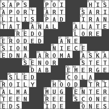 ACROSS 1. Plant excrements 5. Luau course 8. Part of HMS, perhaps 11. To the left, to Queeg 13. Tate display 14. Indian skirt 15. Ms. Damita and namesakes 16. Groovy apt. 17. SW Asia republic 18. Make lace 19. Of or related to the anus 21. Having winglike extensions 22. Do over again 24. Old wives' tales, e.g. 25. Eaten away 27. One (Scot) 29. The Jewish people; Israel 30. Sibling's daughter 32. Pulitzer Prize-winning author Ferber 33. Odor 35. "____ silly question..." 39. Sir (Sp.) 41. Proofreading order 42. Small moist lump or mass 43. Develop 45. Downhill vehicle 48. Root beer relative 49. Agitated, as a liquid 50. Parka part 52. Three (prefix) 55. _ mater 56. Large cup 57. Keyboard key 59. Adolescent 60. To riddle 61. Biscuitlike quick bread 62. Begley and Asner 63. Binary compound 64. Singles DOWN 1. Table seasoning 2. Capital of Western Samoa 3. Characterized by complete cowardliness 4. Indian title of respect (Mr.) 5. Dad 6. Relating to the mouth 7. It would 8. Ethiopian city, capital of Harari 9. Feeling or showing extreme anger 10. Trig term 12. Sadhe (variant) 14. Grain storage tower 20. Allow head to fall sleepily 21. Actor Baldwin 23. Ferber et al. 25. Compass dir. 26. To free from 27. Direct toward a target or goal 28. Teachers' org. 30. Not either 31. Artist's stand 33. Santa ___, CA 34. Director Reiner 36. Ski resort town in Vermont 37. Barrel 38. Had dinner 40. Whirlpool 43. Environmental prefix 44. Methods 45. Having a sole or soles 46. Citrus fruits 47. Enthusiasm 49. Assign a rank or rating to 50. Took on color 51. Double curve, resembling the letter S 53. French philosopher Descartes 54. Angers 56. Medical imaging device (abbr.) 58. Non-commissioned officer (abbr.)