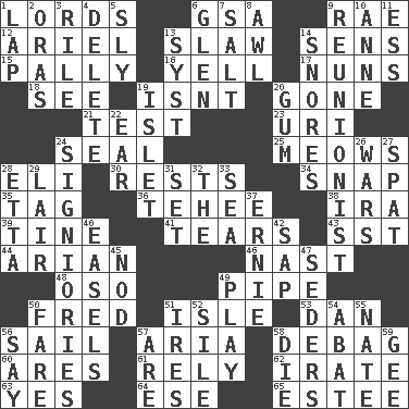 ACROSS 1. Titled peers of a realm 6. Girls' org. (abbr.) 9. Actress Charlotte 12. Satellite of Uranus 13. Cole _ (cabbage dish) 14. Elected reps. 15. Chummy 16. Shout 17. Religious women 18. Perceive with the eye 19. Is not 20. Went 21. Trial 23. RI univ. 24. Lick closed 25. Catcalls? 28. Connecticut Ivy Leaguer 30. Musical pauses 34. Fastener 35. Label 36. Giggle 38. Retirement account (abbr.) 39. Prong on a fork 41. Pulls into pieces 43. Fast jet (abbr.) 44. Believer in; advocate of (suffix) 46. Political cartoonist Thomas 48. Bear (Spanish) 49. Corncob 50. Flintstone 51. Small island 53. Daniel's nick name 56. Travel by water 57. Roberta Peters solo 58. Debunk (Brit. slang) 60. Ancient Greek god of war 61. Have trust in 62. Feeling or showing extreme anger 63. Consenting reply 64. Compass dir. 65. First name in cosmetics DOWN 1. Infant locale 2. Mouths or openings 3. Cause heat under the collar 4. Erase 5. Roguish 6. Small, secluded valley 7. Table seasoning 8. Leather borer 9. One who advocates reunion 10. Singer Murray 11. Curvy letter 13. System (abbr.) 14. Sounds asleep 19. Small island 20. Chewing product 22. Hearing organ 24. Seigniories (variant) 26. Armed conflicts 27. Argument over a trivial matter 28. Singer James 29. Den 31. Arrange properly for use 32. Definite Article 33. Ocean 37. Bert's buddy 40. Artist's stands 42. Plant excrement 45. Allow head to fall sleepily 47. Spring feasts 49. Frolic 50. Conductor's collection 51. Angers 52. Filth; sediment 54. Blind as ____ 55. Nathan's nickname 56. Declare 57. "We ___ not amused" (Victoria) 58. Pass on 59. Unit of force equal to gravity