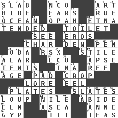 ACROSS 1. Thick slice 5. Non-commissioned officer (abbr.) 8. Nonscientific branch of learning 11. Flintstone garb 12. Hearing organs 14. Regret 15. Sea 17. Brightly colored fish 18. Inactive volcano in Sicily 19. Watched over 21. Bathroom 23. Perceive with the eye 25. Greek god of love 26. Burn to charcoal 27. Lair 28. Writing instrument 31. Chief or king in Benin or Nigeria 33. Acura sports coupe 35. Vertical member of a panel or frame 37. Having or resembling wings 38. Environmental prefix 40. Domed church section 41. Portable shelters 43. _ tizzy (2 wds.) 45. Portuguese money of account (variant) 46. Personal question 47. Groovy apt. 50. Riding implement 52. Old wives' tales, e.g. 53. Snakelike fish 54. Food holders 56. Chalkboards 61. Central Nebraska county 62. "Death on the ____" 65. Remain 66. Shade tree 67. At sea 68. Queen of England 1702-14 69. Hustle 70. Teat (slang) 71. Afternoon social gatherings DOWN 1. Attempt 2. Louse (plural) 3. An important port of Yemen 4. Necklace unit 5. Modern: prefix 6. Head covering 7. Spoke pompously 8. Johnson of "Laugh-In" 9. The smallest animal of a litter 10. Beverage made from leaves 13. Dinah or Pauly 16. Soft 18. Raised railways 20. Letter starter 22. Charged particles 24. Celtic language 26. Haul 28. Corncob 29. Otherwise 30. Born 31. Cassini of fashion 32. Object of repulsion 34. One more than ninety 36. Canvas cover 37. "One Day ___ Time" 39. At one time in the past 42. Blemish 44. Ancient Greek god of war 48. Sports stadium 49. Cease 51. Rounded earthenware pot or jar 52. Pet locale 54. Many (prefix) 55. Mass 57. Blind as ____ 58. Prong on a fork 59. Pulitzer Prize-winning author Ferber 60. Observes 61. Part of a journey 63. Luau accessory 64. Ingest