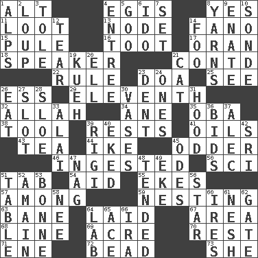 ACROSS 1. The first octave above the treble staff 4. Armor plate that protects the chest 8. Consenting reply 11. Spoils 13. Connecting point 14. Papal veil 15. Whine 16. A blast of a horn 17. Northwest Algerian city 18. Orator 21. Continued (abbr.) 22. Court order 23. ___ good deed 25. Observe 26. Double-curved letter 29. Veterans Day date 32. Assad's deity 34. A saturated hydrocarbon 35. Chief or king in Benin or Nigeria 38. Utensil 39. Musical pauses 41. Petroleums 43. Beverage made from leaves 44. Mamie's mate 45. More peculiar 46. Consumed 50. _-fi 51. Keyboard key 54. Help 55. Makes supply last 57. Amid 59. Inhabiting a nest 63. Object of repulsion 64. Put down 67. Length times width 68. Actor's bit 69. 1/640 square mile 70. Take ten 71. Compass dir. 72. Necklace unit 73. A female animal or person DOWN 1. High mountains 2. Central Nebraska county 3. Lacquered or enameled metalware 4. Main course 5. Thick or sticky substance 6. Wedding promise 7. Arrange properly for use 8. Tall tales 9. Maternal 10. Message 12. Pull into pieces 14. Egg _ yung 19. Malaysian steamed pastry 20. Pipe bend 21. Domesticated feline 23. Gouge 24. Washington bills 26. Ingest 27. Slit 28. _ gin 30. Flower holders 31. Parka part 33. Jai _ 36. Auction offers 37. Actor Baldwin 39. Swiss mountan, "Queen of the Mountains" 40. Supplemented with great effort 42. Indian title of respect (Mr.) 45. Lyric poems 47. Tired old horse 48. Watched over 49. Supplement with great effort 51. Eating place 52. With great haste 53. Child's nurse 56. Play the lead 58. Born 60. Angers 61. Tender 62. Yard entry 64. Experiment locale 65. Adept person 66. Lyricist Gershwin