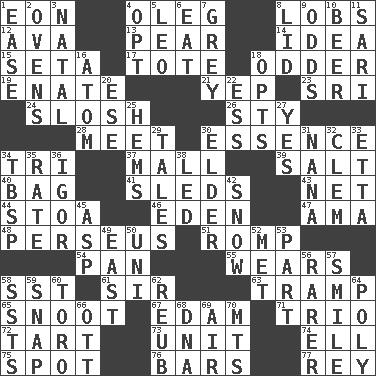ACROSS 1. A really long time 4. Cassini of fashion 8. Tennis shots 12. Actress Gardner 13. Lightbulb-shaped fruit 14. The content of cognition 15. Bristle 17. Carryall 18. More peculiar 19. Related on the mother's side 21. Slangy assent 23. _ Lanka 24. Agitate, as a liquid 26. Filthy place 28. Confront 30. Core 34. Three (prefix) 37. Shopping center 39. Table seasoning 40. Paper or plastic container 41. Bobsleighs 43. Fish or hair follower 44. Portico 46. Locale of original sin 47. Nursemaid (var.) 48. Son of Zeus who helped slay Medusa 51. Frolic 54. Baking dish 55. Erodes 58. Fast jet (abbr.) 61. Title for a knight 63. _____ steamer (cargo ship) 65. Snob 67. Dutch treat 71. Musical group of three 72. Small pie 73. A single undivided whole 74. Pipe bend 75. Specific locale 76. Soap units 77. Marina Del _, California DOWN 1. Comfort 2. Baking chambers 3. Relating to or accompanying birth 4. Choose 5. Lion 6. Ingest 7. Jennifer or Joel 8. Flaplike covering 9. Likelihood 10. Fermented drink made from hops 11. Indian skirt 16. Tiny particle 18. Chooses 20. Compass dir. 22. Curvy letter 25. Cloth borders 27. It is so 29. Falsehoods 30. A person who is older than you are 31. Grandmother 32. Clement's nick name 33. Singer James 34. Cook's measure (abbr.) 35. Pace 36. Russian composer Stravinsky 38. Directed 42. Frozen precipitation 45. Cleo's killer 49. Compass direction 50. University (slang) 52. Was introduced to 53. Component 56. More uncommon 57. Grin 58. Fast planes 59. Fastener 60. "Corrida" creature 62. Reuben's nickname 64. Many (prefix) 66. Baseball player Mel 68. Heredity factor (abbr.) 69. Atmosphere 70. Mountains (abbr.)