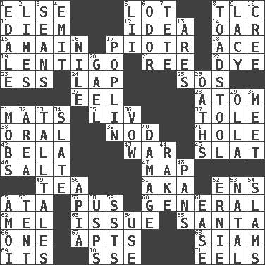 ACROSS 1. Otherwise 5. Car dealer's back yard 8. Affectionate concern, for short 11. South Vietnam president (1954) 12. It may be bright or harebrained 14. Boat paddle 15. With great haste 17. Peter (Polish) 18. Adept person 19. Small, flat, pigmented spot on the skin 21. To separate or throw off 22. Color 23. Curvy letter 24. Infant locale 25. Mayday 27. Snakelike fish 28. Smallest unit of an element 31. Floor coverings 35. 54 in ancient Rome 37. Lacquered or enameled metalware 38. Taken by mouth 39. Allow head to fall sleepily 41. Hollow 42. Actor Lugosi 43. Armed conflict 45. Narrow board 46. Table seasoning 47. Atlas unit 49. Afternoon social gathering 51. Alias (abbr.) 52. Followers of ems 55. _ moment's notice (2 wds.) 57. Fluid product of inflammation 60. Commissioned military rank 62. Cartoonist voice _ Blanc 63. Come out of 65. Before Barbara or Clara 66. Single 67. Tenement units (abbr.) 68. Thailand, formerly 69. ___ a Wonderful Life 70. Compass dir. 71. Snakelike fish DOWN 1. Peak District village in England 2. Citrus fruits 3. Seines 4. Give off 5. Cards in a Roman deck? 6. Scent 7. Wig 8. Inedible or poisonous agaric 9. Made of lace 10. Algonquian 13. Ancient Greek god of war 16. The longest river in the world 17. Cotton for raincoats, e.g. 20. Highlander 26. Curses 29. Rounded earthenware pot or jar 30. Rendezvous 31. Crowds into 32. Length times width 33. Baron Munchausen's specialties 34. Schedule 36. Solemn pledge 40. Break 44. Immoral or dissolute person 48. Baking dishes 50. Capital of Western Samoa 52. Bert's buddy 53. Relating to or accompanying birth 54. Hits or strikes with great force 55. Mine, in Marseilles 56. Portable shelter 58. United States Postal Service (abbr.) 59. Fast planes 61. Comfort 64. Purpose