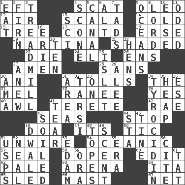 ACROSS 1. Newt 4. Scram, to a cat 8. Margarine 12. Atmosphere 13. Any of the three canals of the cochlea 14. Lacking warmth 15. Family _ (genealogy) 17. Continued (abbr.) 18. Celtic language 19. Chrissie's court nemesis 21. Cast a shadow over 23. Expire 24. Biblical high priest 26. Followers of ems 27. So be it 28. Without 30. Black tropical American cuckoo 31. Ringlike coral islands and reefs 34. Definite Article 37. Cartoonist voice _ Blanc 38. Indian princess (variant) 39. Consenting reply 40. Leather borer 41. Cylindrical with tapered ends 42. Actress Charlotte 43. Oceans 44. Constrict 46. ___ good deed 47. ___ a Wonderful Life 50. Nervous spasm 51. Undo the wiring of 54. Pertaining to the sea 57. Lick closed 58. Drug addict 60. Prepare for publication 62. Light colored 63. Sports stadium 64. Call ___ day 65. Downhill vehicle 66. Vertical spar for supporting sails 67. Remaining after all deductions DOWN 1. Erode 2. Securely fixed in place 3. Excercise machine 4. Biscuitlike quick bread 5. Lessep's creation 6. Keyboard modifier key 7. Bits 8. Seas 9. Titled peers of a realm 10. Otherwise 11. Wrote a lyric poem 13. _-fi 16. 4th largest of the Great Lakes 20. Nine, plus one 22. Coop moms 25. Small island 27. Afresh 29. Toward shelter 30. Nursemaid (var.) 31. Type of rug 32. Tarsus (plural) 33. Single 34. Polypeptide antibiotic 35. Pile 36. Compass dir. 41. Lacerate 43. Dirtied 44. R.R. building 45. Prong on a fork 46. A sleeping potion; an opiate (poet.) 48. Drinks excessively 49. Aroma 51. United States Postal Service (abbr.) 52. Be tempered by heat 53. Dutch treat 55. Epoch 56. Quote 59. Mouth or opening 61. Make lace
