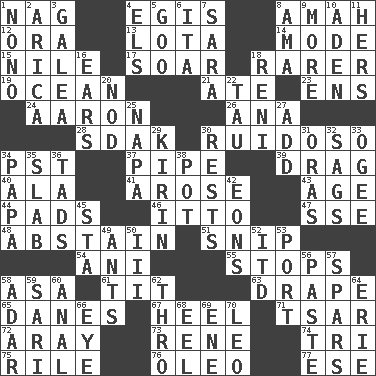 ACROSS 1. Tired old horse 4. The front part of a cuirass 8. Wet nurse 12. Mouth or opening 13. Globular water bottle used in Asia 14. Method 15. "Death on the ____" 17. Fly high 18. More valued for its uncommonness 19. Sea 21. Had dinner 23. Followers of ems 24. Composer Copland 26. Santa ___, CA 28. Neighbor of Neb. 30. Noisy, rowdy, vocal (Spanish) 34. Pacific Standard Time (abbr.) 37. Corncob 39. To trail on the ground 40. Chicken ___ king 41. Came up 43. Personal question 44. Writing tablets 46. "Tell ____ the Marines!" 47. Compass dir. 48. Choose not to consume 51. Clip 54. Cuckoo 55. Closes up, plugs up 58. White ___ sheet 61. Teat (slang) 63. Window treatment 65. Natives or inhabitants of Denmark 67. The bottom of a shoe or boot 71. Russian ruler of old 72. Like ___ of sunshine 73. French philosopher Descartes 74. Three (prefix) 75. Cause heat under the collar 76. Margarine 77. Compass dir. DOWN 1. Words to Nanette 2. N. Chile seaport 3. An organ shaped like a helmet 4. Raised railways 5. Thick or sticky substance 6. Call ___ day 7. "Two Mules for Sister ____" 8. Nursemaid (var.) 9. Greater amount 10. An important port of Yemen 11. Possessive pronoun 16. Hearing organs 18. Painter Guido (1575-1642) 20. Dreamland 22. The 19th letter of the Greek alphabet 25. California wine valley 27. Find the sum of 29. Japanese brewing company 30. Musical pauses 31. Mouths or openings 32. Sinks 33. Double curve, resembling the letter S 34. Dad 35. Thick slice 36. Small boys 38. Plant holder 42. Immeasurably long periods of time 45. R.R. building 49. Pismires 50. One more than two 52. It would 53. Sweet dark-red dessert wine 56. Thick mixture 57. Practice fights 58. The sixth month of the Jewish calendar 59. Indian skirt 60. Of or related to the anus 62. Through, poetically 64. 4th largest of the Great Lakes 66. Sight organ 68. Snakelike fish 69. Compass dir. 70. Lion