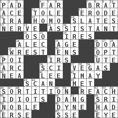 ACROSS 1. Writing tablet 4. Distant 7. Naughty child 11. Adept person 12. Lacquered or enameled metalware 13. Eat (away) 14. Retirement account (abbr.) 15. Same (prefix) 16. Chalkboards 17. Boldness 19. Helper 21. Bear (Spanish) 23. Angers 24. Actor Baldwin 25. Personal question 26. ___ good deed 29. Obtain by seizing forcibly or violently 30. Followers of ems 31. Choose 32. Luau course 33. Big collection agency 34. Shoshoni 35. Curve 36. _-fi 37. Viva Las _ 40. Teachers' org. 41. Area sheltered from the wind 42. "If ____ say so..." 43. Skim 45. Was introduced to 46. Making a chance decision by using lots 51. Arrive at 55. Foolish or stupid persons 56. Mild oath, euphamism for damn 58. Indian title of respect (Mr.) 59. Impressive in appearance 60. Centimeter-gram-second unit of force 61. Possessed 62. Celtic language 63. Compass dir. 64. Sight organ DOWN 1. Ache 2. Measure of real estate 3. Letter starter 4. Egg _ yung 5. _ mater 6. Vintage cars 7. Naughty children 8. Round or rotation of duties 9. Arabian gulf 10. Trial 12. College papers 13. Otherwise 16. Fathers 18. Short-tailed, large-bodied rat 20. Omens 22. Sep. follower 24. N. Chile seaport 25. Nest on high 26. A city in N France, SE of Calais 27. Elects 28. Had dinner 29. Had on 32. Baking dish 33. Ancient Celtic tribe of eastern Britain 36. Narrow boards 37. Zeal 38. Develop 39. Yard entry 43. Fur scarf 44. Quote 46. Trig term 47. Aroma 48. Teases 49. Probability 50. Negative votes 52. American tennis player Robert 53. Supercomputer manufacturer 54. Flintstone garb 57. Compass dir.