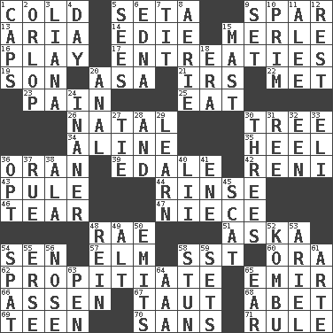 ACROSS 1. Lacking warmth 5. Stalk of a moss capsule 9. Coast Guard woman 13. Roberta Peters solo 14. Singer Brickell 15. Haggard of country music 16. Shaw product 17. Pleas 19. Male child 20. White ___ sheet 21. Big collection agency 22. Was introduced to 23. Ache 25. Ingest 26. Brizilian seaport 30. Relationship diagram 34. Place in a line 35. Person who is morally reprehensible 36. Northwest Algerian city 39. Peak District village in England 42. Painter Guido (1575-1642) 43. Whimper 44. Remove soap 46. Separate forcefully 47. Sibling's daughter 48. Actress Charlotte 51. "____ silly question..." 54. Elected rep. 57. Shade tree 58. Fast jet (abbr.) 60. Mouth or opening 62. Conciliate 65. Independent ruler or chieftain 66. NE Netherlands city 67. Tense 68. Collude with 69. Adolescent 70. Without 71. Court order DOWN 1. Smile enhancers 2. Lowest deck of a ship 3. Woody, climbing, usually tropical plant 4. 24 hours 5. Observes 6. Pulitzer Prize-winning author Ferber 7. Teat (slang) 8. Nest on high 9. Put into a specified state 10. Demure 11. Toward shelter 12. Repose 15. Vertical spar for supporting sails 18. Period 20. Of or related to the anus 24. More lacking in sense or substance 27. Neckwear 28. Also 29. Memorize 30. Triads 31. To sift 32. Car or cant ending 33. Connecticut Ivy Leaguer 36. Choose 37. Regret 38. Insect wing 40. Cards in a Roman deck? 41. Compass dir. 45. Go away! 48. It's straight from the horse's mouth 49. Keyboard modifier key 50. Sends forth 52. Dried seaweed eaten as food 53. Satellite of Uranus 54. Petty quarrel 55. Celtic language 56. Olfactory organ 58. Make senseless or dizzy 59. Arranges properly for use 61. Johnson of "Laugh-In" 63. Writing instrument 64. American Automobile Association (abbr.) 65. Ewer handle