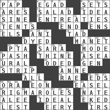ACROSS 1. Infant food 4. Mild oath 8. Arranges properly for use 12. Ancient Greek god of war 14. First course 16. The content of cognition 17. Trig term 18. Pleas 20. Portable shelters 22. Conclude 23. Followers of ems 24. Raised railways 25. Black tropical American cuckoo 28. Small boy 30. Colored 31. French painter Edouard 35. Parent Teacher Assoc. 37. "Two Mules for Sister ____" 40. Method 41. Romantic infatuation 42. One or ones belonging to thee 44. At sea 45. Mountain range 46. Wrote a lyric poem 47. Commissioned mil. rank 48. Empty completely 50. Queen of England 1702-14 52. Everything 54. Actress Charlotte 55. Begley and Asner 58. Mouth or opening 61. Period of immesurable duration 63. Artist's stand 65. Frustrating wastes of time 70. Nathan's nickname 71. Toward shelter 72. Perfect 73. Made supply last 74. For fear that 75. Suggestive of the supernatural 76. Big collection agency DOWN 1. Thick mixture 2. Satellite of Uranus 3. Actor Sean's family 4. Compass dir. 5. Separate the seeds from cotton 6. Keyboard modifier key 7. Have the gumption 8. Be seated 9. Singer Brickell 10. Adolescent 11. Backtalk 13. Arrange properly for use 15. Gouge 19. First man 21. Declare 26. A home for chicks 27. Potato state 29. Break 30. Mexican or Central American flower 32. Characteristic smell of wine 33. Paradise 34. Afternoon social gathering 35. Piece 36. Russian ruler of old 38. To free from 39. Approach 41. Fluid product of inflammation 43. Pulitzer Prize-winning author Ferber 49. Entreaty 51. Born 53. Australian parrot (variant) 55. 1973 Nobel Price Winner (Physics) Leo 56. Prevent from occurring 57. Bobsleighs 58. Spoken 59. Cause heat under the collar 60. Eras 62. Thickened enlargement 64. A saturated hydrocarbon 66. Was introduced to 67. Area sheltered from the wind 68. Ewer handle 69. Secret