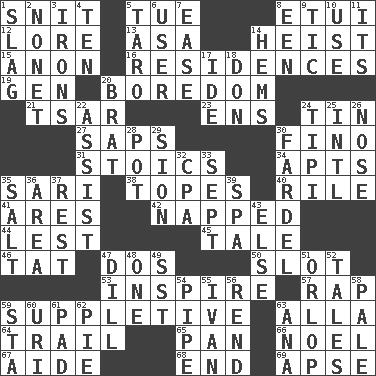 ACROSS 1. In a ____ (agitated or irritated) 5. Third day of the wk. 8. Needle holder 12. Old wives' tales, e.g. 13. White ___ sheet 14. Robbery 15. Soon (poet.) 16. Dwellings 19. Commissioned military rank (abbr.) 20. Mood resulting from idleness 21. Russian ruler of old 23. Followers of ems 24. Shallow baking pan 27. Plant excrements 30. Fine (Spanish) 31. Unemotional ones 34. Tenement units (abbr.) 35. Indian skirt 38. Drinks excessively 40. Cause heat under the collar 41. Ancient Greek god of war 42. Slept 44. For fear that 45. Story 46. Make lace 47. Two (Sp.) 50. Narrow opening 53. Heighten or intensify 57. Reproach for some lapse or misdeed 59. Supplementary 63. Silent film actress Nazimova 64. Hang back 65. Baking dish 66. Christmas carol 67. Assistant 68. Conclude 69. Domed church section DOWN 1. Volcanic refuse 2. Music written for nine 3. Metal shackles 4. "___ Little Indians" 5. Edible starchy tuberous root 6. One who makes use of a thing 7. Comfort 8. Car or cant ending 9. Nervous spasm 10. Purpose 11. ___ a Wonderful Life 14. Folds over and sews together 17. Binary compound 18. Spanish title 20. Naughty child 22. Help 24. Native american tent (variation) 25. International (abbr.) 26. Sense of smell 28. Plant holder 29. The Jewish people; Israel 30. Pack 32. Accounting whiz (abbr.) 33. Back-to-school mo. 35. Table seasoning 36. Length times width 37. Take ten 39. Health resort 43. Otherwise 47. Deli pickle 48. Single 49. Fast jet (abbr.) 51. Fourth or lowest deck 52. Falsehoods 54. Corncob 55. _ the terrible 56. Tear apart 58. Diluted with white 59. R.R. building 60. RI univ. 61. Writing tablet 62. Sliced dessert 63. Santa ___, CA