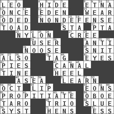 ACROSS 1. Lion 4. Flintstone garb 8. Inactive volcano in Sicily 12. Single time 14. Paradise 15. Erode 16. Wrote a lyric poem 17. Unrelated to defense, as in spending 20. Frog relative 21. R.R. building 22. Parent Teacher Assoc. 23. High-strength synthetic material 27. Algonquian 29. One who makes use of a thing 31. Against 34. Trap for birds or small mammals 35. In a ____ (agitated or irritated) 36. In addition 39. Label 41. Snake ____ (dice throw) 42. Sliced desserts 43. Lessep's creation 46. Prong on a fork 47. Person who is morally reprehensible 48. Toward the sea 51. Memorize 54. Sep. follower 56. Mouth edge 58. Immeasurably long periods of time 61. Conciliate 66. Mitch Miller's instrument 67. Pacific island yam 68. Musical group of three 69. Change direction abruptly 70. System (abbr.) 71. Coop moms 72. Curvy letter DOWN 1. Plunder 2. Inside; within (prefix) 3. Sea 4. Layer 5. Wedding promise 6. Lair 7. Extremities 8. She-sheep 9. 3-inch nail 10. Political cartoonist Thomas 11. Length times width 13. Whirlpool 18. And so on (abbr.) 19. At a great distance 24. Nilotic language 25. Bear (Spanish) 26. A home for chicks 28. Artist's stand 30. Arrive at 32. Neckwear 33. It is 34. Olfactory organs 36. Fitting 37. Cards in a Roman deck? 38. Legislators 40. Highlander 44. Born 45. Chicken ___ king 49. Biblical high priest 50. Small island 52. Vintage cars 53. Having high moral qualities 54. Elects 55. Supercomputer manufacturer 57. Heart or essence 59. Common sense 60. Perceives with the eye 62. Cooking vessel 63. "We ___ not amused" (Victoria) 64. Shallow baking pan 65. Greek goddess of the dawn