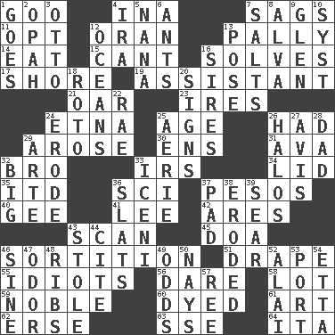 ACROSS 1. Thick or sticky substance 4. _ tizzy (2 wds.) 7. Sinks 11. Choose 12. Northwest Algerian city 13. Friendly 14. Ingest 15. Patter 16. Finds the solution 17. Dinah or Pauly 19. Helper 21. Boat paddle 23. Angers 24. Inactive volcano in Sicily 25. Mature 26. Possessed 29. Came up 30. Followers of ems 31. Actress Gardner 32. Sis' sibling 33. Big collection agency 34. Hat (slang) 35. It would 36. _-fi 37. Mexican monetary units 40. Turn to the right 41. Area sheltered from the wind 42. Ancient Greek god of war 43. Skim 45. ___ good deed 46. Drawing lots 51. Window treatment 55. Foolish or stupid persons 56. Have the gumption 58. Car dealer's back yard 59. Impressive in appearance 60. Colored 61. Nonscientific branch of learning 62. Celtic language 63. Compass dir. 64. Call ___ day DOWN 1. Moves 2. Brightly colored fish 3. "Beetle Bailey" pooch 4. Retirement account (abbr.) 5. Grandmother 6. Pismires 7. Table seasonings 8. Inventor's middle name 9. Small, secluded valley 10. System (abbr.) 12. Seas 13. Airs 16. Begets 18. Printing process, for short 20. Attaches a signature 22. Actress Charlotte 24. Wear away 25. Nest on high 26. Radiant circles of light 27. Deliberation 28. Male parent 29. Johnson of "Laugh-In" 32. Massive 33. Ancient Celtic tribe of eastern Britain 36. Narrow boards 37. Groovy apt. 38. Worn away 39. Scorch 43. Took without asking 44. Quote 46. Trig term 47. Scent 48. Teases 49. Probability 50. Negative votes 52. Jai _ 53. Sweet dark-red dessert wine 54. Singer James 57. Portuguese money of account (variant)
