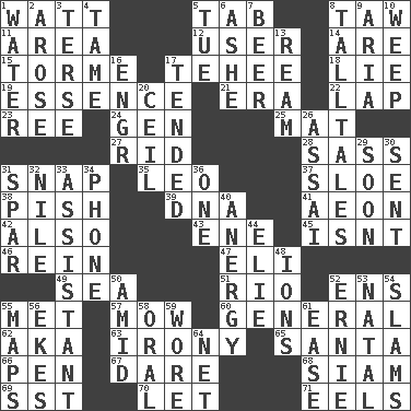 ACROSS 1. Electrical Unit 5. Keyboard key 8. The 23rd letter of the Hebrew alphabet 11. Type of rug 12. One who uses or employs something 14. "We ___ not amused" (Victoria) 15. Singer Mel 17. Giggle 18. Whopper 19. Core 21. Epoch 22. Infant locale 23. To separate or throw off 24. Commissioned mil. rank 25. Floor covering 27. To free from 28. Backtalk 31. Fastener 35. Lion 37. _ gin 38. Expression of disdain 39. Heredity factor (abbr.) 41. A really long time 42. In addition 43. Compass dir. 45. Is not 46. It's straight from the horse's mouth 47. Connecticut Ivy Leaguer 49. Ocean 51. River (Sp.) 52. Followers of ems 55. Was introduced to 57. Cut the grass 60. Commissioned military rank 62. Alias (abbr.) 63. Literary sarcasm 65. Before Barbara or Clara 66. Fenced enclosure 67. Have the gumption 68. Thailand, formerly 69. Fast jet (abbr.) 70. Allow 71. Snakelike fish DOWN 1. Wetness 2. Came up 3. Laconic 4. Not wild 5. Third day of the wk. 6. American tennis player Robert 7. Fermented drink made from hops 8. Baron Munchausen's specialties 9. Operatic vocal solo 10. Shed a tear 13. 480, 500 or 516 sheets of paper 16. Engineer (abbr.) 17. Looked after 20. To provide with a ceiling 26. Slender Brazilian palm 29. Within a short period 30. Emitted 31. Practice fight 32. The longest river in the world 33. Aide 34. Give a jingle 36. Single 40. Disorder of the immune system 44. Writer Wiesel 48. Charged atoms 50. Among 52. Bert's buddy 53. Brizilian seaport 54. Criticizes harshly 55. Atlas contents 56. Makes supply last 58. Of the mouth 59. Had on 61. Comfort 64. Fish or hair follower