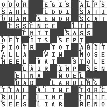 ACROSS 1. Scent 5. The front part of a cuirass 9. High mountains 13. Indian skirt 14. Farming town in central California 15. Suttee (variant) 16. NW Algerian seaport 17. Sir (Sp.) 18. Scram, to a cat 19. Gist 21. Falsehood 22. Send forth 23. Backtalk 24. Often (poetically) 27. It is 28. Back-to-school mo. 29. Peter (Polish) 31. Small child 32. "This won't hurt ____!" 36. Silent film actress Nazimova 37. Acquire through effort 38. Characteristic smell of wine 39. Person who is morally reprehensible 40. Large container 41. Fur scarf 42. Den 44. Naughty child 46. Elected rep. 47. Inactive volcano in Sicily 48. Christmas carol 50. June honoree 51. Preparing or cooking with lard 54. Slanted text style (abbr.) 56. Place in a line 58. Torque (variant) 60. General guideline 61. Citrus frut 62. Singer Brickell 63. Observes 64. One who doesn't tell the truth 65. Western Nevada city DOWN 1. Bear (Spanish) 2. Have the gumption 3. Mouths or openings 4. Wash lightly 5. Chooses 6. Went 7. Wedding promise 8. Title for a knight 9. Helper 10. Shoestrings 11. Parent Teacher Assoc. 12. Be seated 17. In a ____ (agitated or irritated) 20. Arab leader 21. Pet locale 23. Arrange properly for use 24. Brightly colored fish 25. Do some clerical work 26. Lacquered or enameled metalware 28. Manchild 30. Baron Munchausen's specialties 31. Teat (slang) 33. Scornful sounds 34. Capri or Wight 35. Adolescent 37. Armed conflict 40. By way of 41. Moved rapidly 43. Also 44. More lacking in sense or substance 45. Greater amount 47. Peak District village in England 49. 61 cubic inches 51. Pale green bean 52. Connecting point 53. Amused look 54. Big collection agency 55. Third day of the wk. 56. 100% 57. Cards in a Roman deck? 59. Corporate head (abbr.)